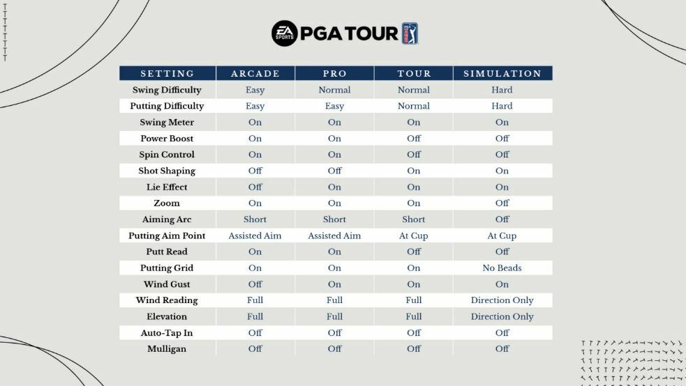 EA SPORTS PGA TOUR features a variety of gameplay styles from arcade settings that assist you with a putting grid, power boost, and spin control to simulation settings that remove all assistance for a true-to-life gameplay experience.