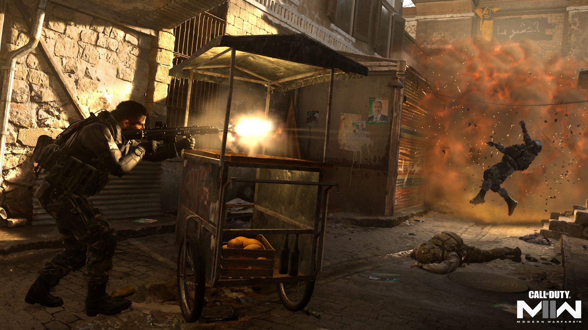 Alley: Somewhere in the Al Mazrah region, a small marketplace is cleared out as strike teams prepare to go in, weapons hot.