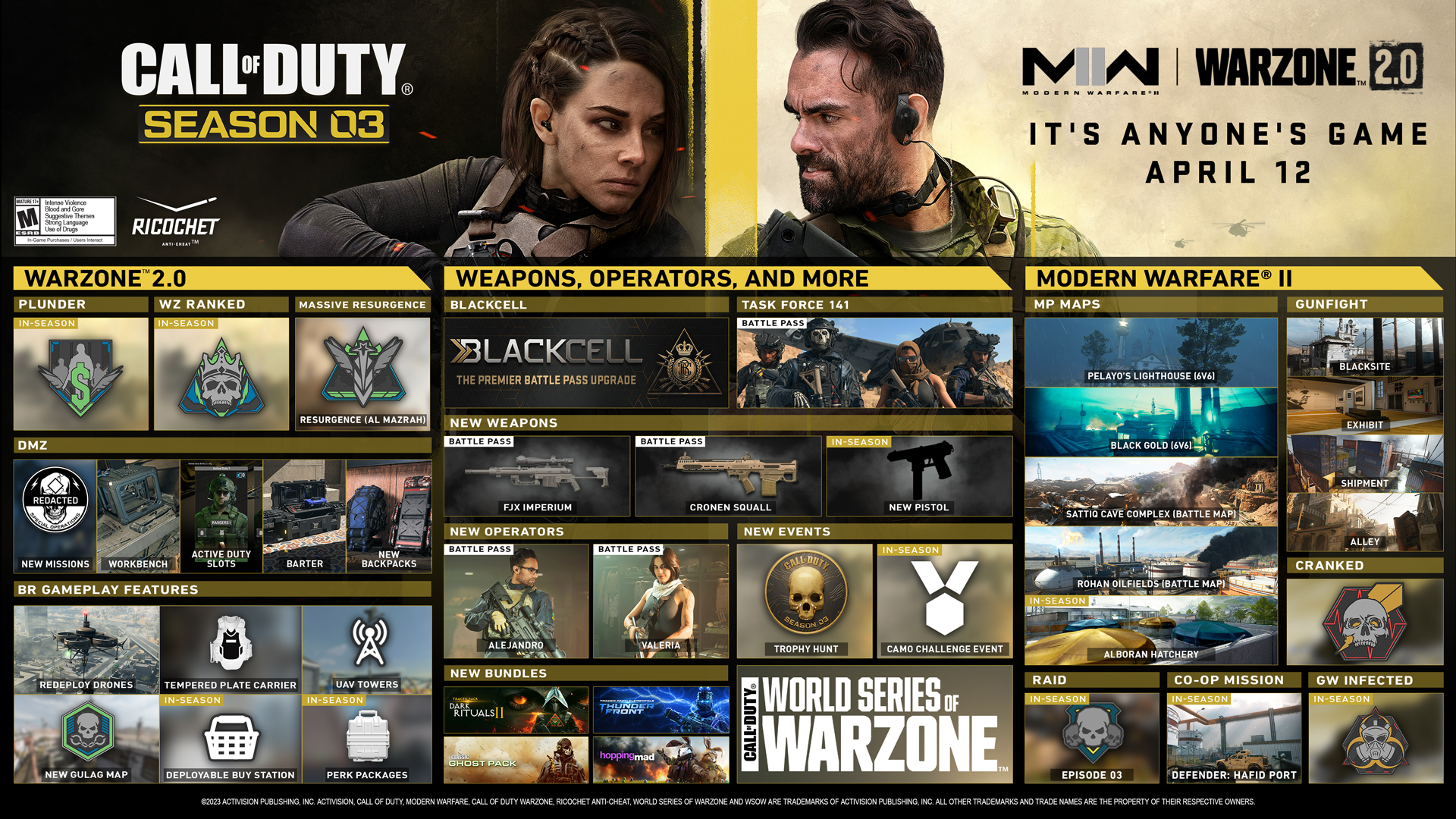 This is Season 03 of Call of Duty: Modern Warfare II and Call of Duty®: Warzone™ 2.0, launching on April 12. During this season, you can expect the return of Gunfight and Plunder, additional features such as the Barter System in DMZ, a legendary Sniper Rifle now under a new manufacturer, the launch of Warzone Ranked Play, and a new way to dominate the Battle Pass AO by joining the ranks of the exclusive BlackCell.