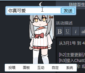 Talk to the table pet! Now supports talking to table pets Prefabricated to comply with table pet behavior Support the use of developer provided services (free) or the use of one's own API Note: When using services provided by developers, chat content may be recorded for future feedback and action learning by desktop pets