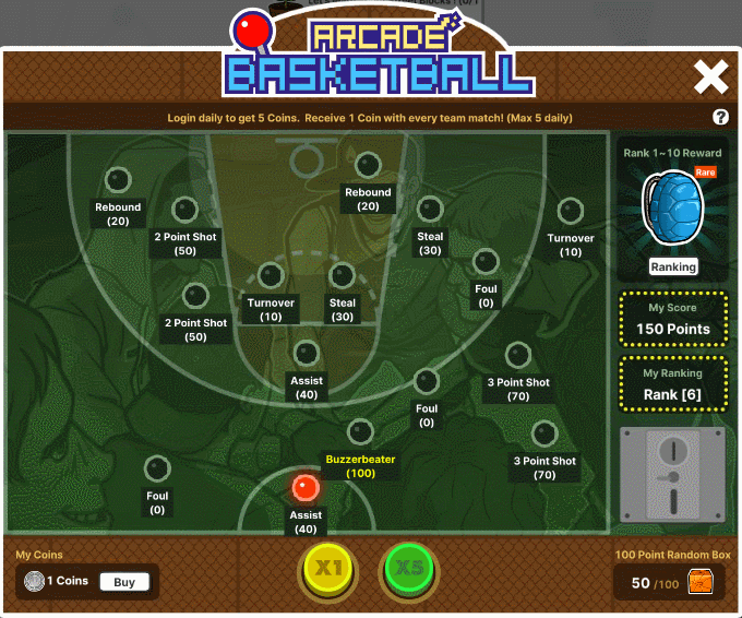 By clicking x1 or x5, the light indicator will traverse through series of basketball skill icon with corresponding points and randomly stop at any moment.