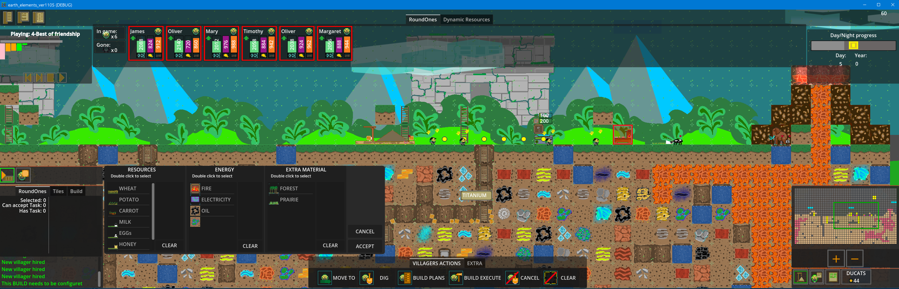 - new selection/issue orders system - use left mouse button to select and right to give order. Like in RTS games. Very easy and convenient way . Nothing in game is done automatically anymore. This means if villager is hungry you need to select him and move him to TABLE build to replenish food. Now building and digging is much easier. Each villager can do independent task. Access to DROPZONE is not that much necessary anymore - which is good for playability.