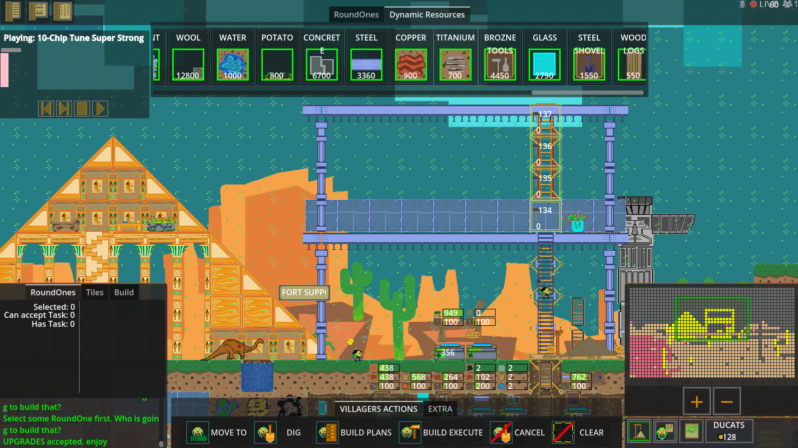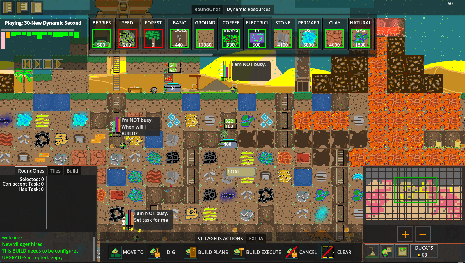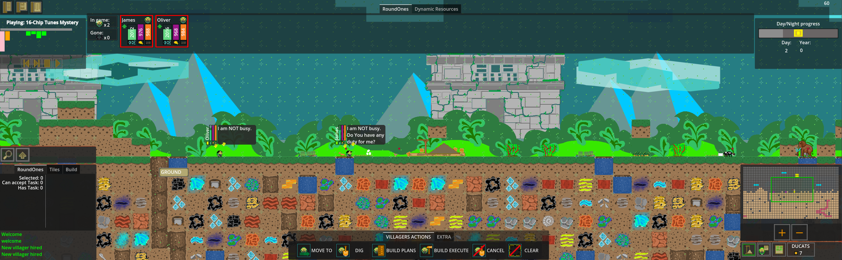 - new redesigned GUI elements - gui is simpler now, more streamlined - for example you selects some build and only specific actions allowed for that build will be shown. Game window can be just grabbed and size adjusted to fit yours screen. Looks very nice on wide screens. Mini map refactored to fit better world sizes. Now game world can be created in way you wont to play: if you need more surface for farming and animals then create very wide world, if You wont to dig more than create map which is longer vertically and you will have plenty of dig tiles.