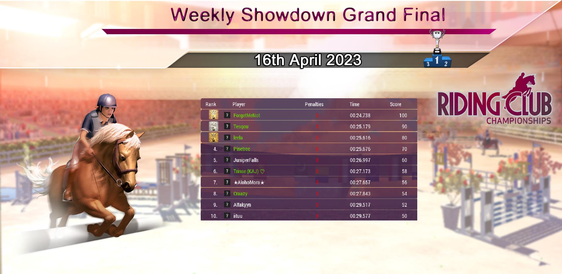 Huge congratulations to our Weekly Showdown Grand Final Winner, ForgetMeNot who wins with a great round! Our course this week again produced a competitive Grand Final with lots of of riders going clear, and less than 1 second between the top 4 riders. Congratulations to everyone who made it through and did so well :)