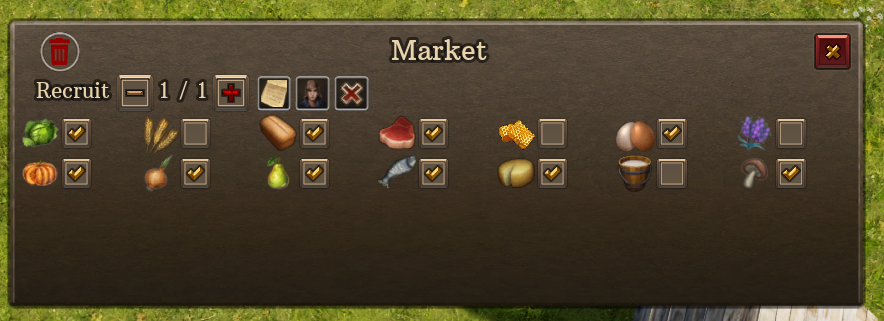 Added the ability to disable the intake of certain foods with the market. The main reason is to allow the players to keep specific resources like wheat, berries, milk and honey in the warehouse, as they are used to make flour, beer, ale mead and cheese. Or you may want to prioritize storing happiness-based food such as bread and cheese.