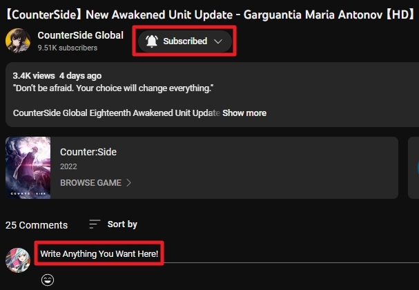 On theGarguantia Maria Antonov’s PV, please leave a comment like the example below and share it with us through the link below. * If you are not subscribed to the Global CounterSide channel, you are not eligible for this event.