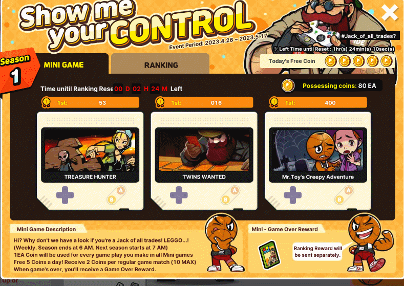 Choose one of the Three Minigames in the Show Me Your Control! Event and play. Aim to reach the highest scores and you will be awarded with rewards!