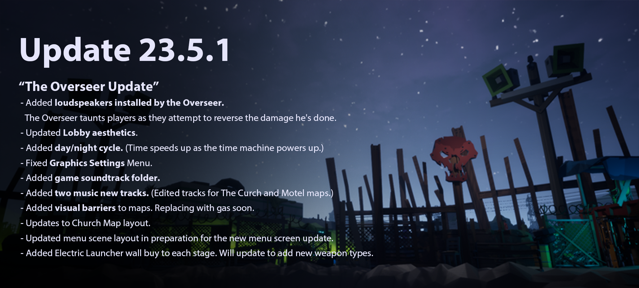 Added loudspeakers installed by the Overseer. The Overseer taunts players as they attempt to reverse the damage he's done. (More voice lines coming soon. The Overseer will watch your progress and attempt to thwart your attempt at salvation.)