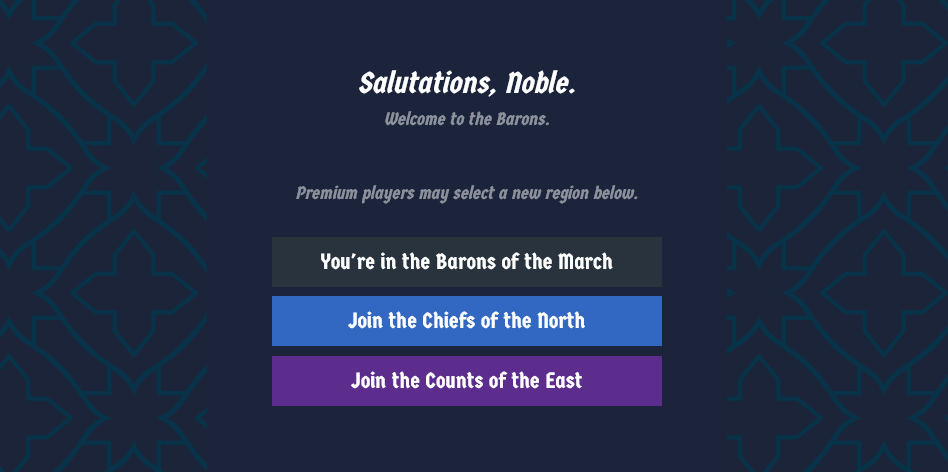 One of the most repeated and strident requests is for Nobles to be able to choose which Region they join. We're extremely pleased to say we've done the hard work behind the scenes to allow for this in both Party Games and Twitch Mode!