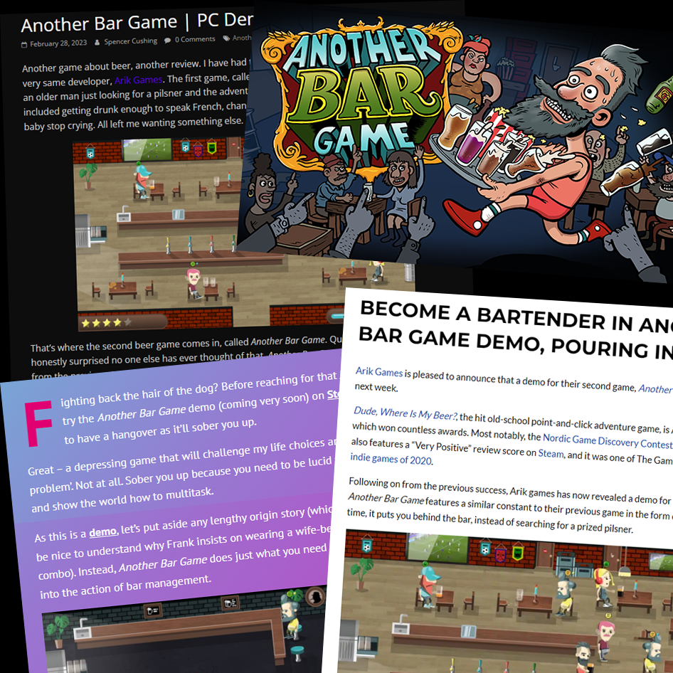 Another Bar Game is a casual action game with elements of time management, simulation and challenging. In this game, you serve craft beer to thirsty bar guests and strive to keep everyone happy. It showcases 30 minutes of gameplay and gives players a taste of what's to come.