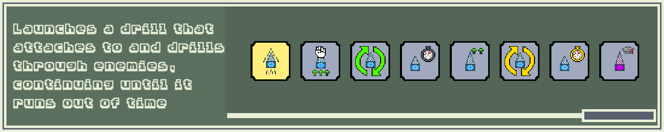 Launches a drill that attaches to and drills through enemies, continuing until it runs out of time