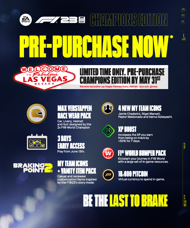 Pre-purchase F1® 23 Champions Edition by May 31, 2023 to unlock the Las Vegas Content Pack as well as receiving 3 days early access, Max Verstappen exclusively designed customisation items, 18,000 PitCoin, and more!*
