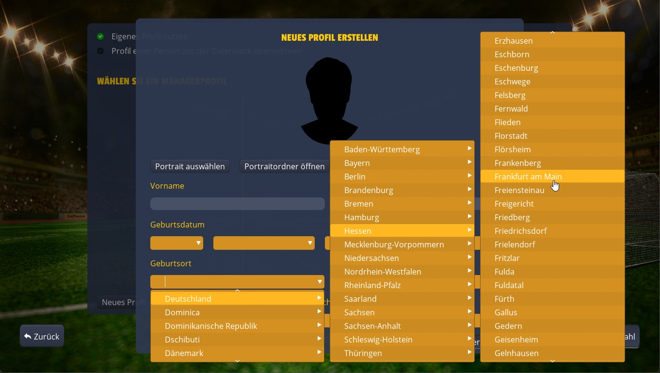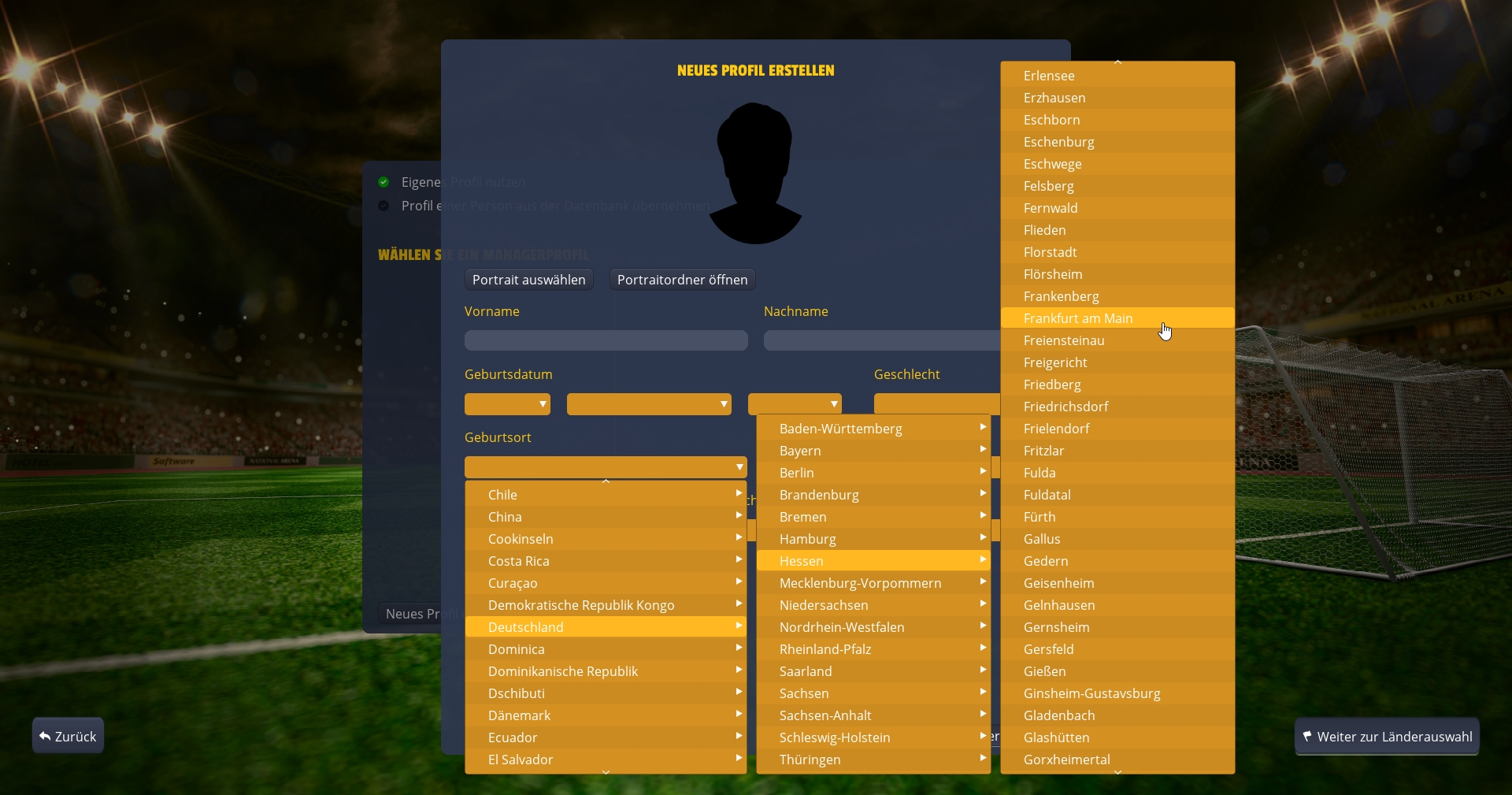 A first challenge were dropdown menus. These should definitely adapt to the available screen size. This can be seen in the following example: When selecting the birthplace, a nested dropdown menu opens: The first image was created at a game resolution of 1360x768, the second at Full-HD (1920x1080). At the larger resolution, there are simply more entries displayed than at the smaller resolution.