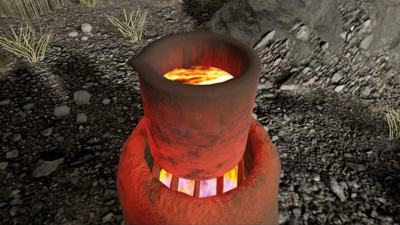 After you mine ores from the ground, you can smelt them and cast them into forms, It's very hot, so you need to equip right tool: tongs. Furnace heats everything thats above it, even you. Later in the game when you progress, this primitive casting is replaced with more industrialized method, so you can craft bigger parts.