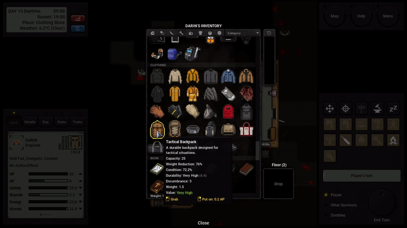 The condition of clothing, which decreases when attacked by zombies or per turn, now varies based on durability, rather than being a fixed value.