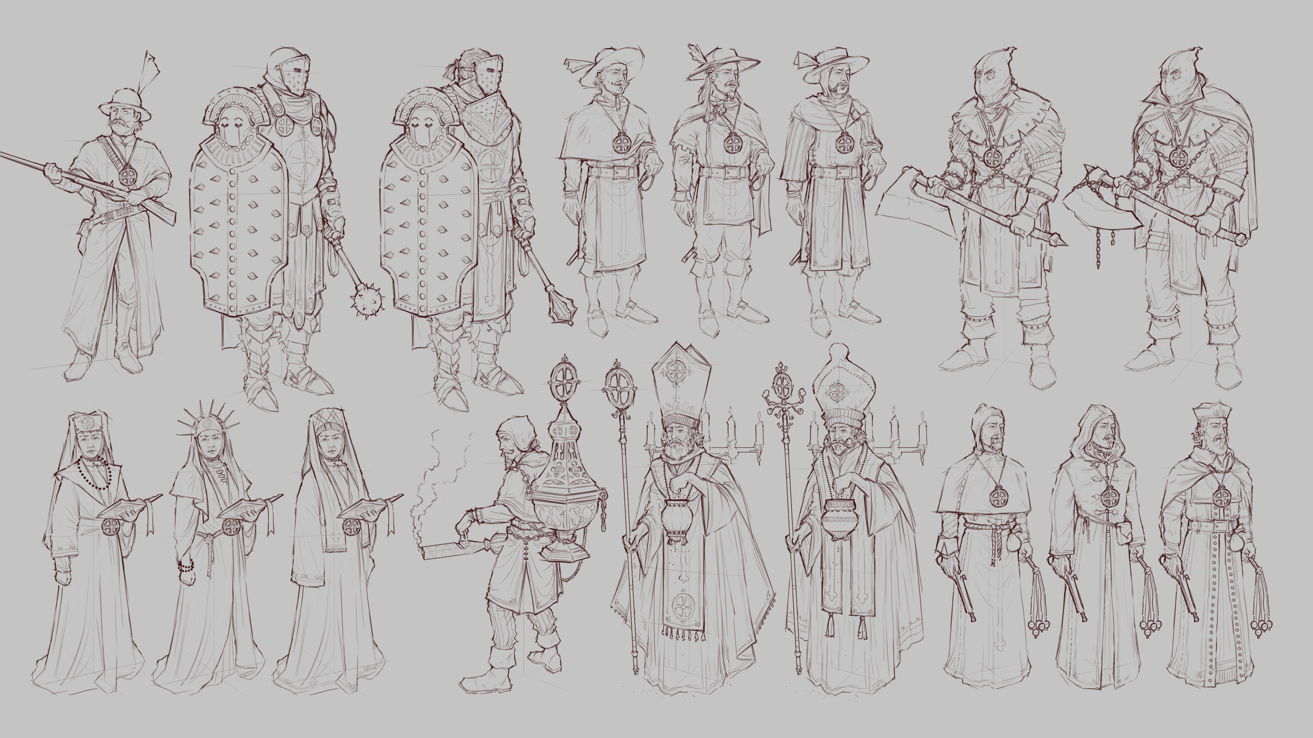 “The inspiration here is quite obvious and partly in the name: The Spanish Inquisition. For a concept artist, this means spending many hours researching the history of the real-life Spanish Inquisition, as well as pop culture references. I discovered that while their infamous red robes were mostly contrived by the popular Monty Python sketch, the color suits any enemy faction perfectly – and it’s probably the color we would have used anyway.”