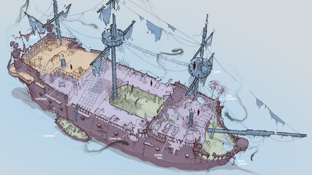“Although none of the crew members themselves had been finalized at that point, a few character ideas were already there and those characters’ areas are present in the earliest rough concept. You can find the Japan-themed tea table there that belongs to the skeletal ship cook Toya, as well as the alchemist desk of ship surgeon Suleidy who is half plant half woman and always ready to patch the crew up. If you look up, you can also see the lookout where the blind sharpshooter Teresa takes aim from.”