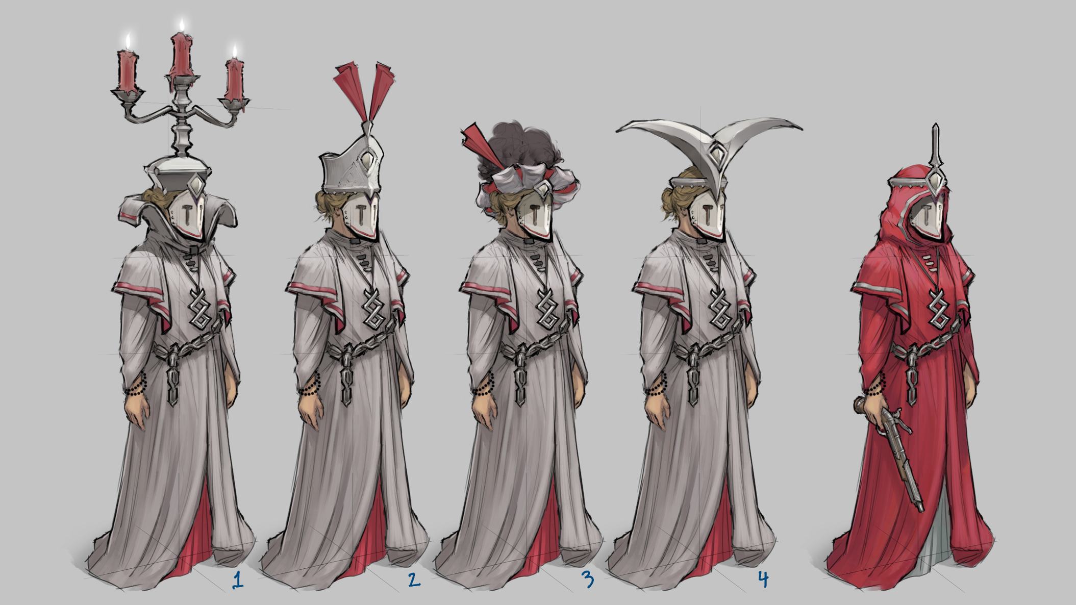 “I intended for the design of their clothing to show some of their cruelty and religious dogmatism, while sprinkling some fantasy elements in there too, like spiky headdresses, weapons and candles. Keep in mind that at this stage only a few details about what the Inquisition stands for and who they worship etc. had been put forward by the writers, so I had to remain rather vague.”
