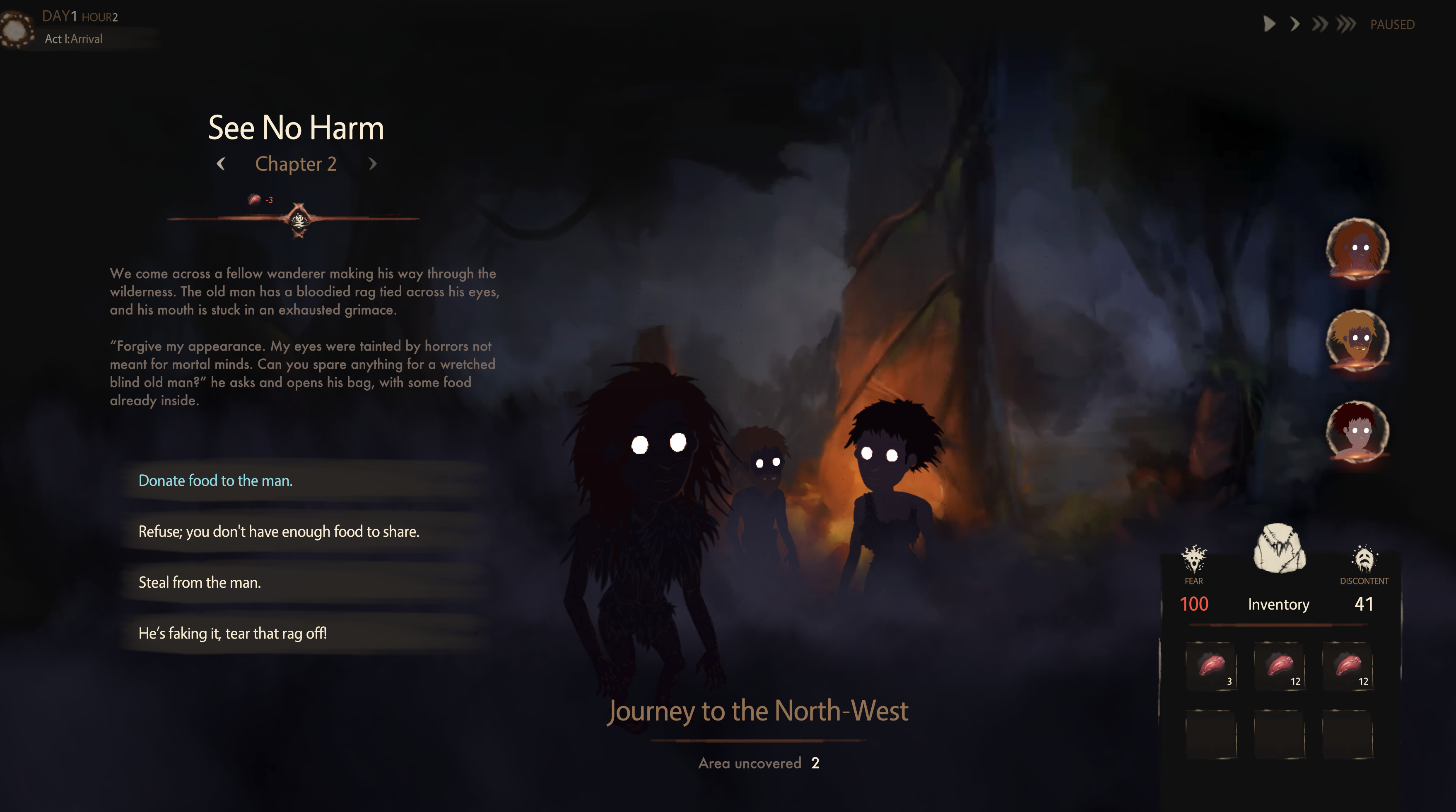 On their Journey, your tribe members may run into a fellow wanderer with a bloody rag tied across his eyes. Would you choose to help this old blind man and hope that your gratitude will be repaid? But resources are scarce, and offering yours up to someone in need might just be what will put yourself in the same position within the very near future. And can you really trust the old man...?