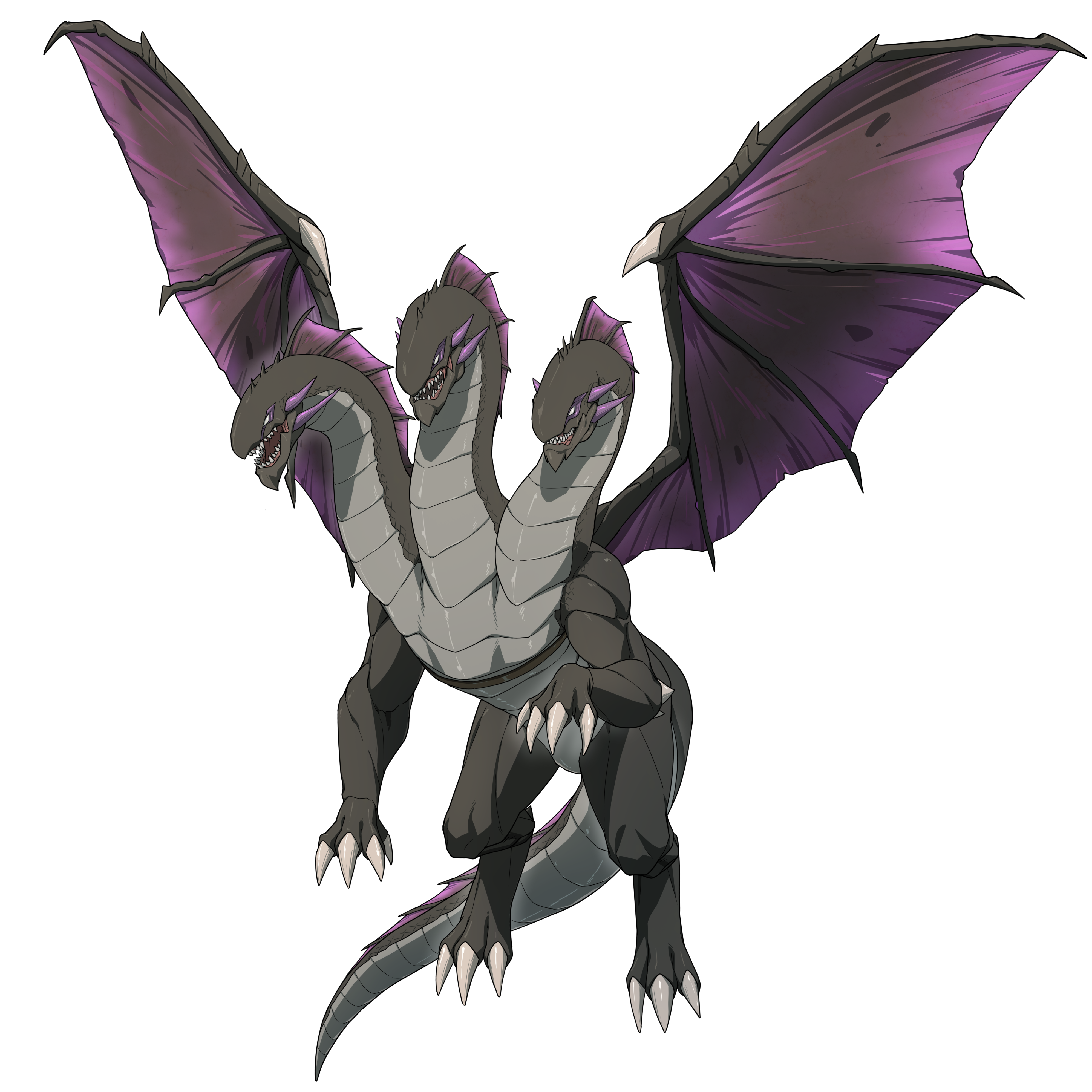 A three-headed monstrous and malevolent creature that combines the awe-inspiring power of a dragon with the dark elemental affinity.