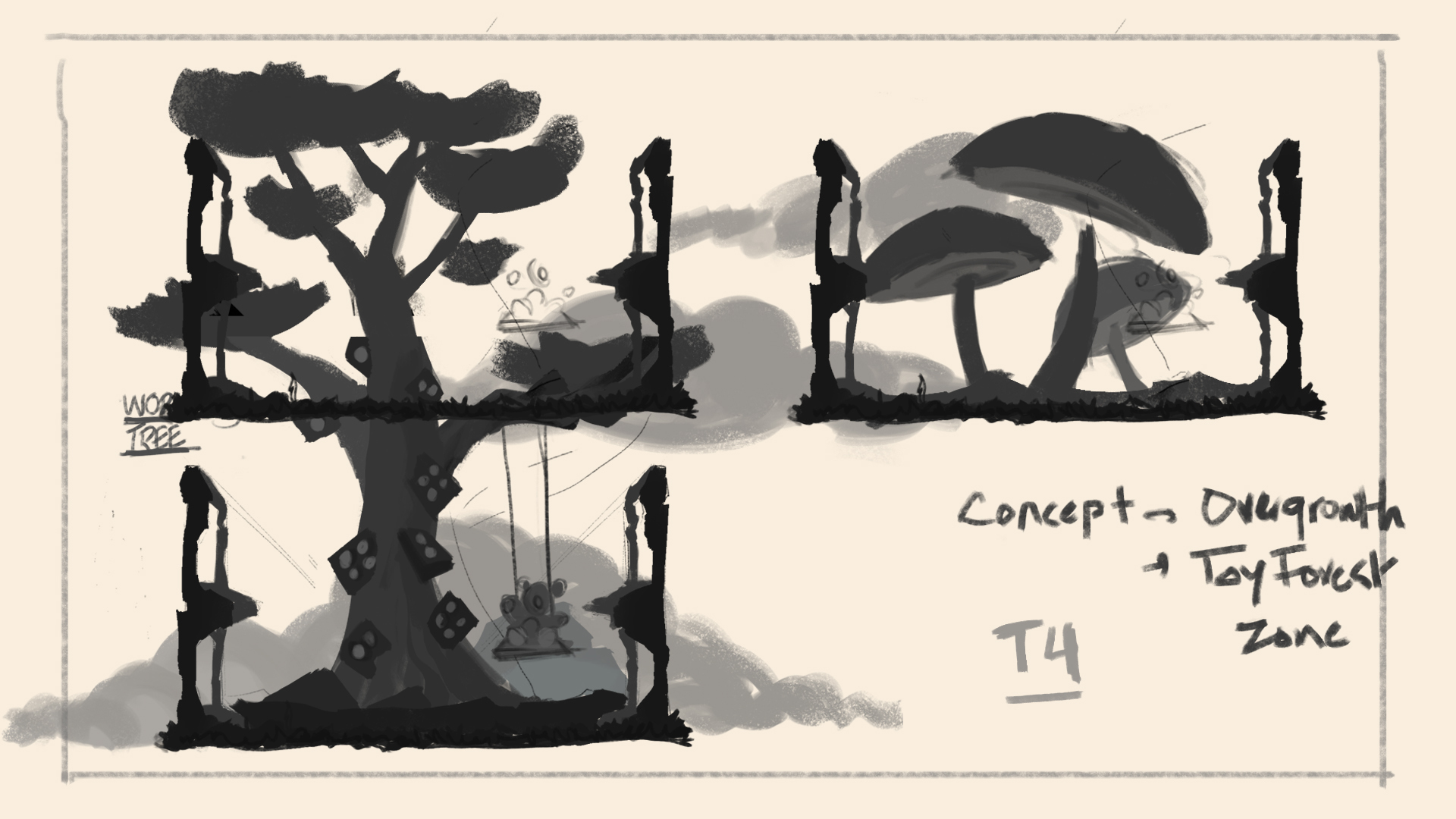 Aesthetically, we aimed for a harmonious blend of natural elements and playful toy-themed structures. Towering trees provide shade and add an organic touch to the landscape, while whimsical giant mushrooms and flowers serve as interactive play areas and points of interest for players to explore.. A vivid blue expanse, adorned with fluffy white clouds that seem to form familiar shapes invites the players to let their imaginations run wild. As the day progresses, the sky transitions into a palette of warm hues, as if signaling the approach of a breathtaking sunset. This dynamic sky adds a touch of magic and wonder to the overall atmosphere, amplifying the sense of awe and discovery as players navigate the zone.