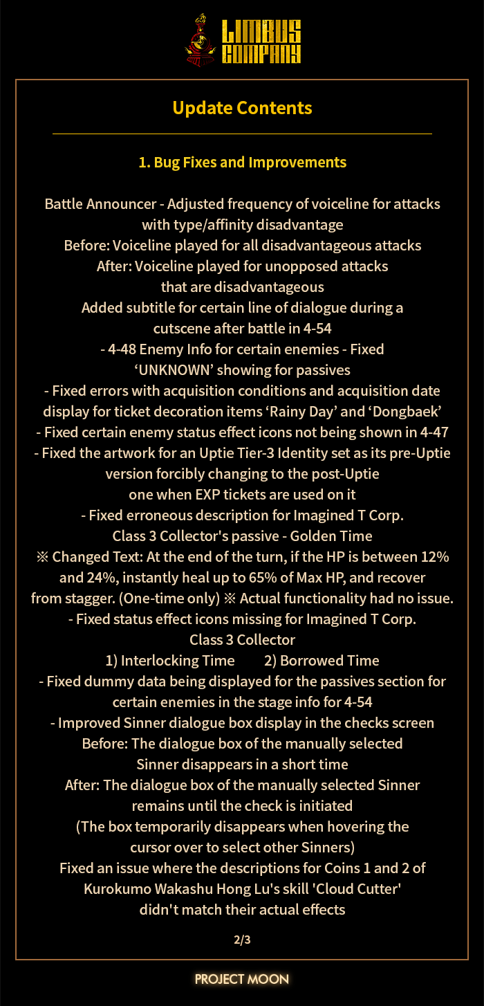An issue where certain status effects that increase or decrease Power for a Sin Affinity can increase or decrease damage to abnormal degrees will be fixed with the June 29th update. Currently, 'Wrath/Sloth Power Up/Down' status effects are increasing or decreasing the damage by N * 100% rather than increasing or decreasing the Power by N. The list of affected skills is as follows: Capote for Meursault Sunshower for Yi Sang