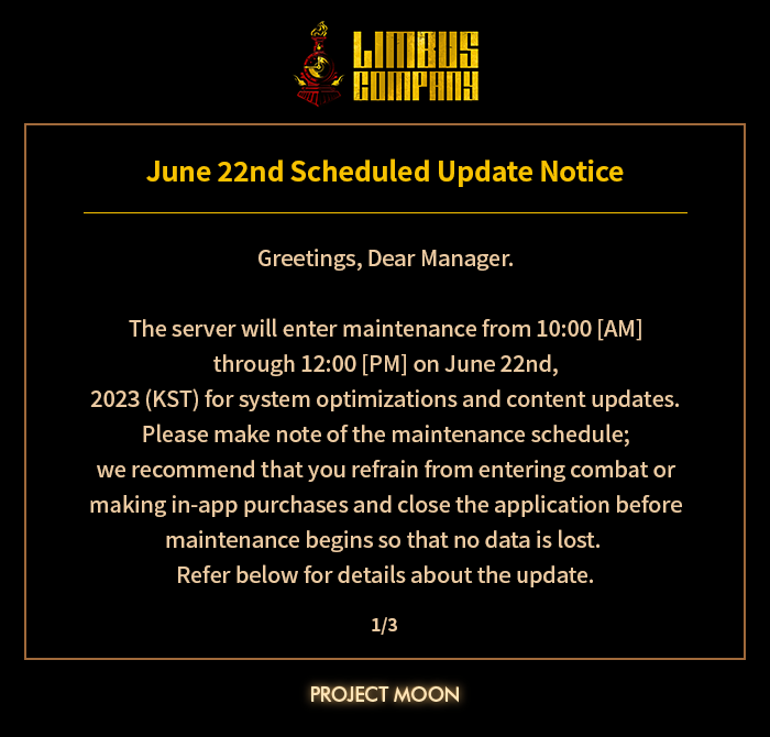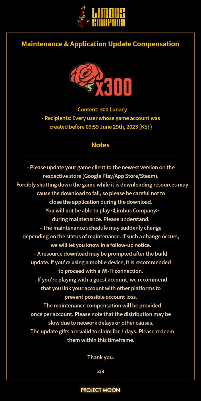 [Compensation] Content: Lunacy x500 Date: Some time after scheduled maintenance on Jun 29 (Thu) (KST) Can be redeemed once per account You can claim the item through the in-game mail system until 2023 Jul 6 09:59 (KST). (Mail Validity Period: 7 days)