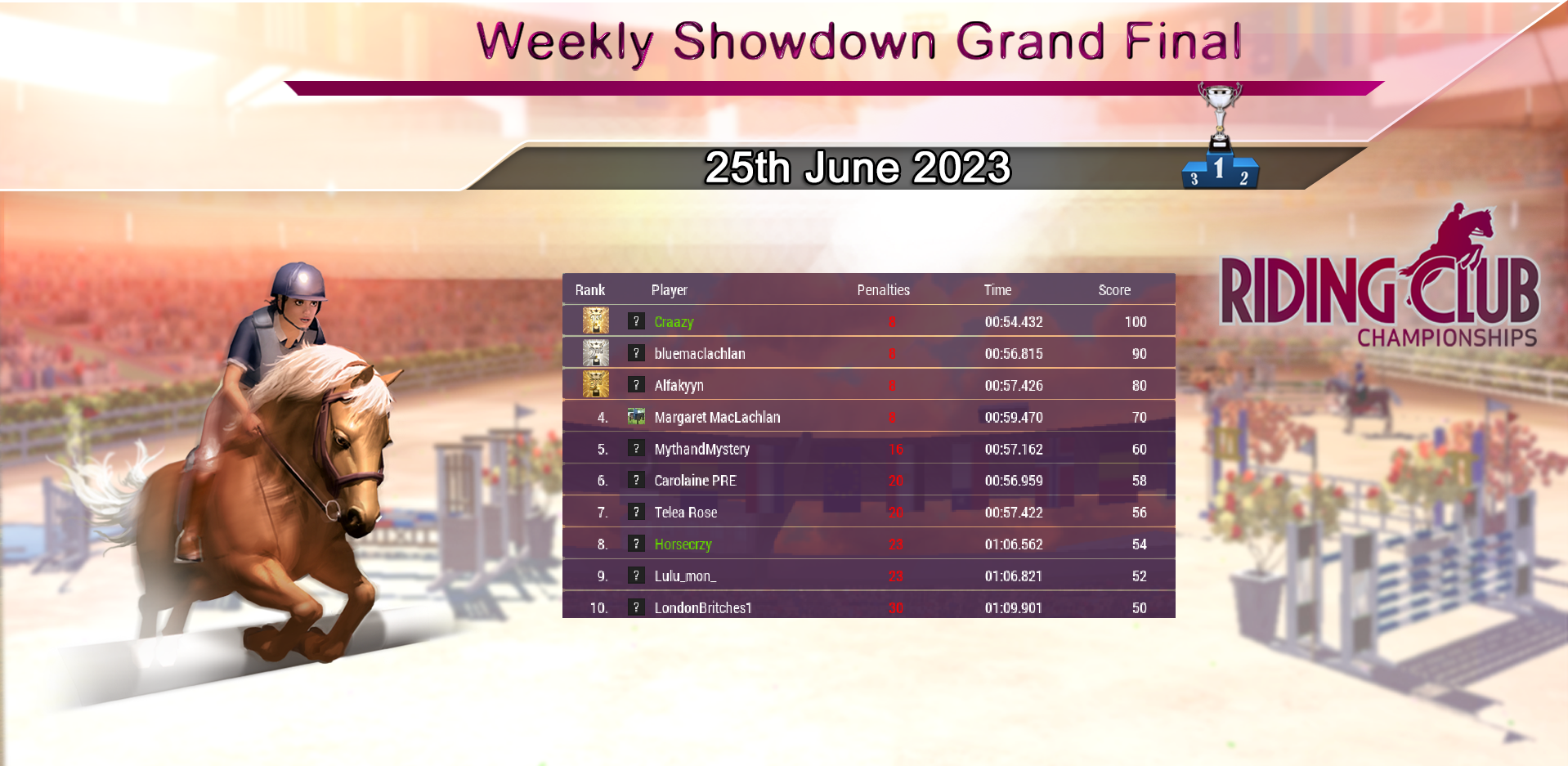 Huge congratulations to our Weekly Showdown Grand Final Winner, Craazy who wins with a great round. Our course this week produced a very competitive Grand Final with no riders going clear. Congratulations to everyone who made it through and did so well :)