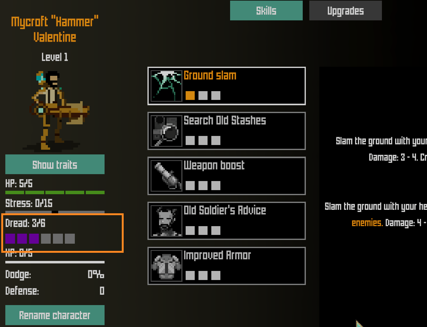 6) Dread can only be taken care of during shelters. All shelter skills have been altered so that they deal with dread, and not with stress (which is always zero during shelter phases and does not really matter there).