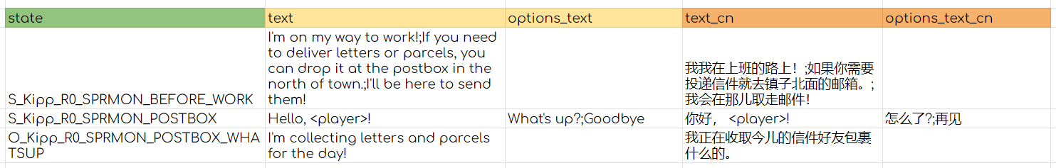 With over 5000 rows of texts in Excel and over 45,000 words (and counting), it's no simple task! This is a snippet of how Kipp's Dialogue data looks like: It has a unique ID (state), English texts for normal dialogue and options, and the translated columns.