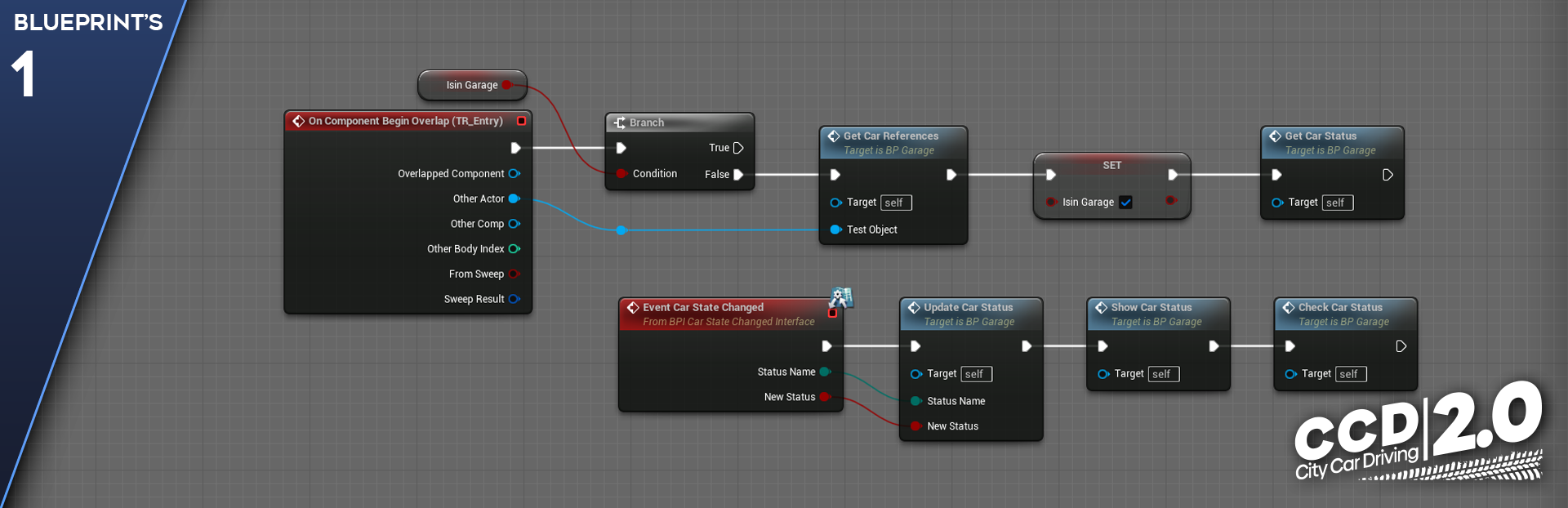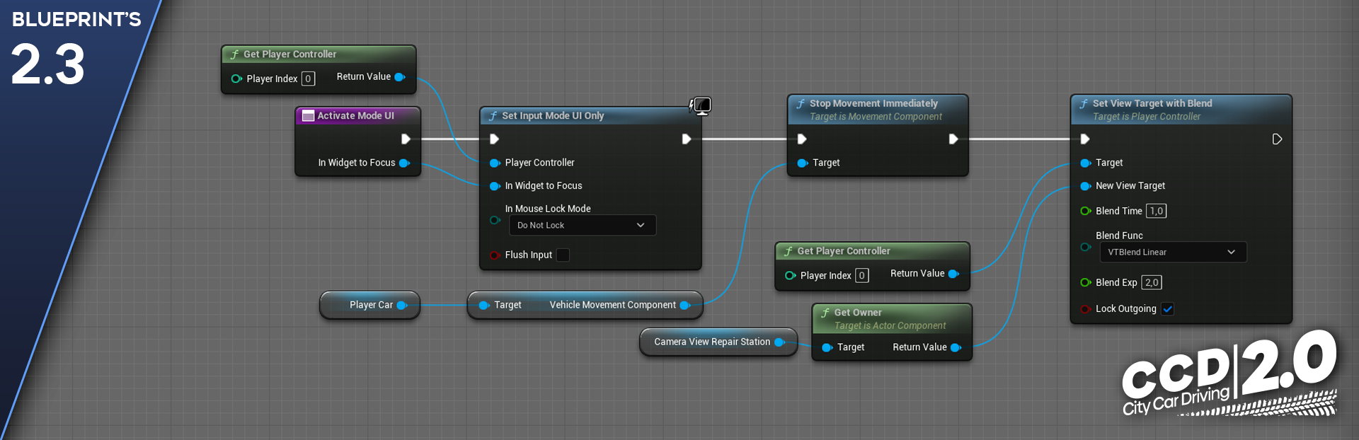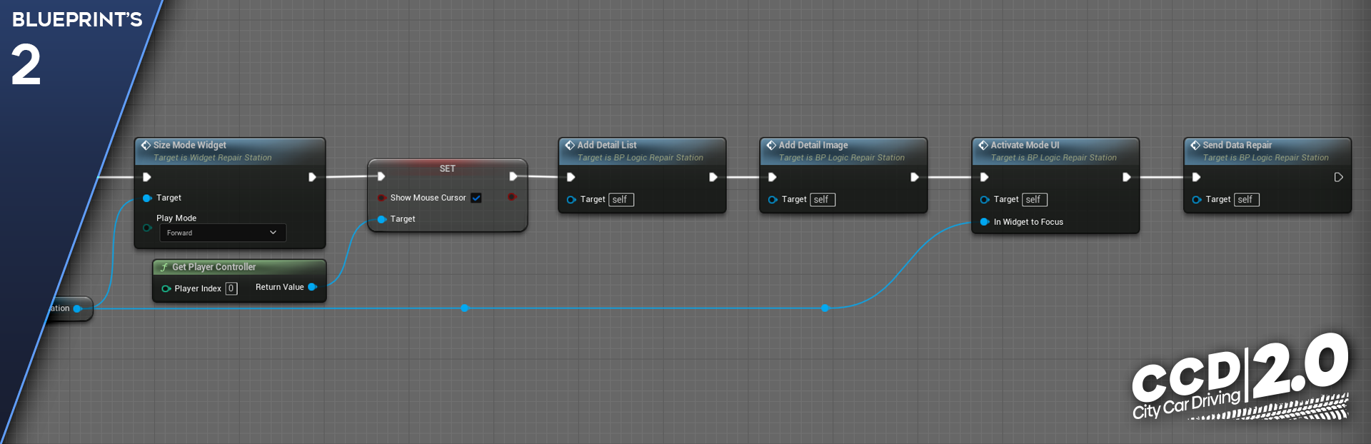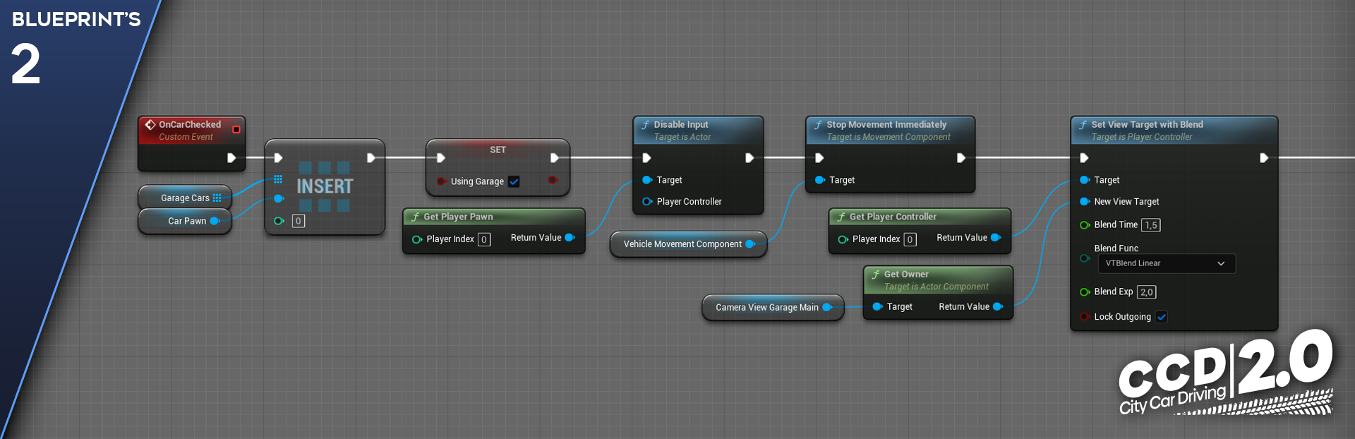 At the entrance to the Garage, the player has a widget with a list of necessary actions. Blueprint gets a link to the car and also checks its initial state.