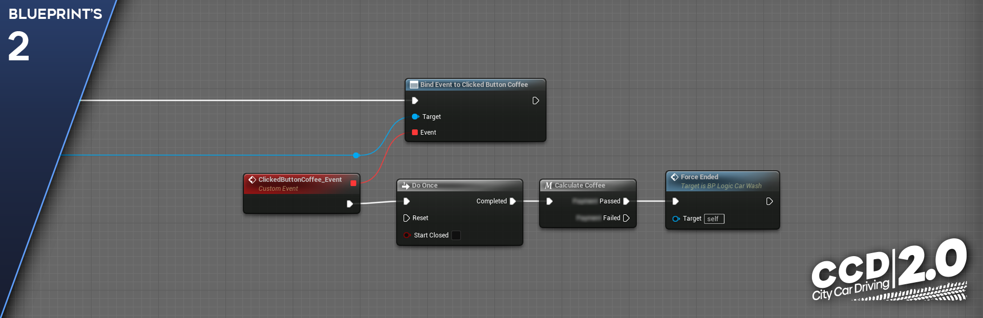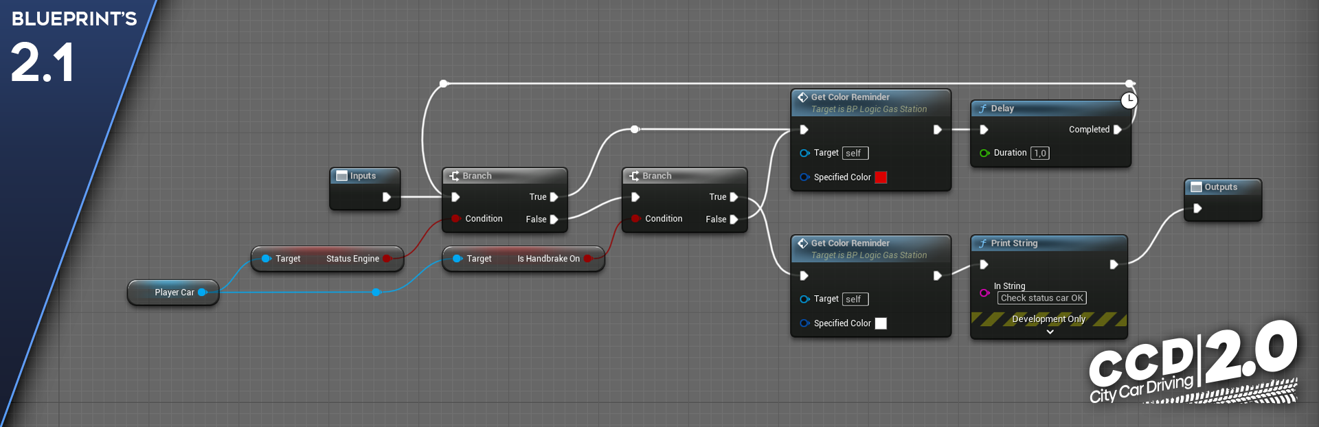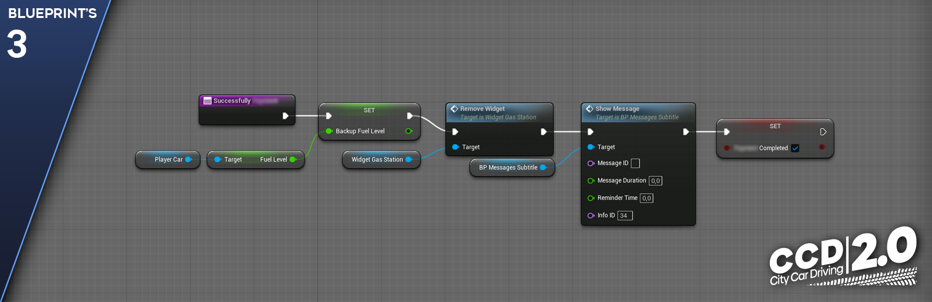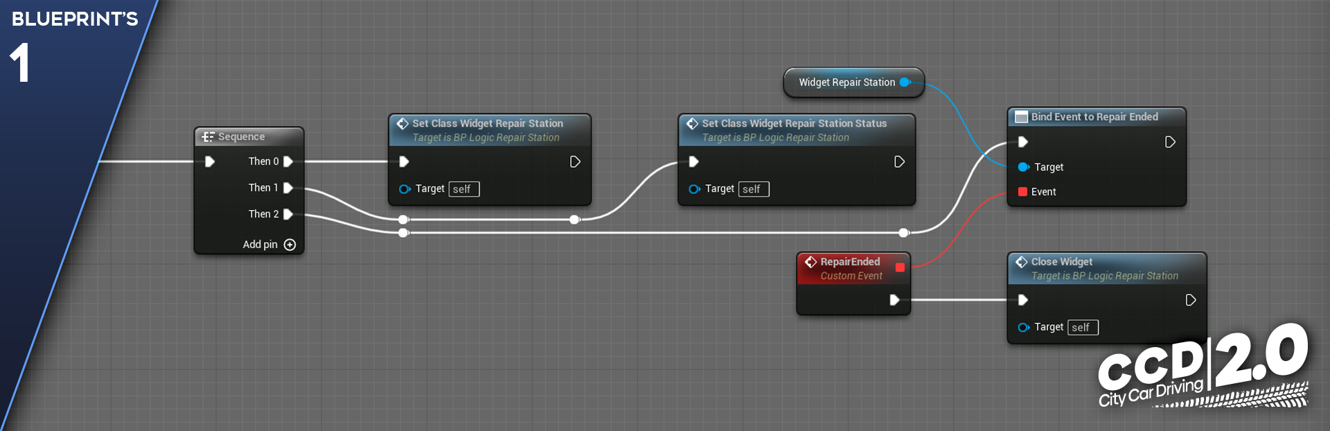 At the entrance to the Garage, the player has a widget with a list of necessary actions. Blueprint gets a link to the car and also checks its initial state.
