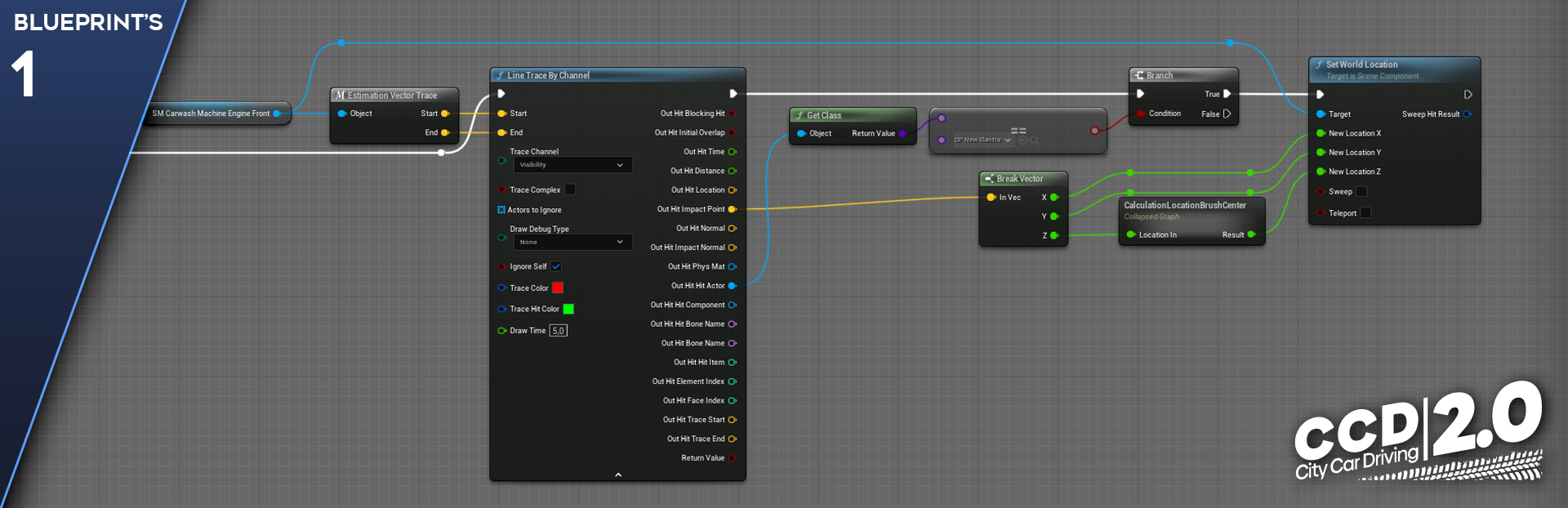 The LineTraceByChannel function “shoots” a beam to track the point of its intersection with the car body geometry, after which it sends the coordinates in which the intersection occurred further.