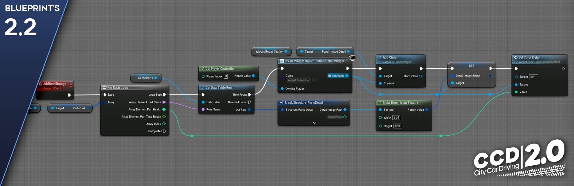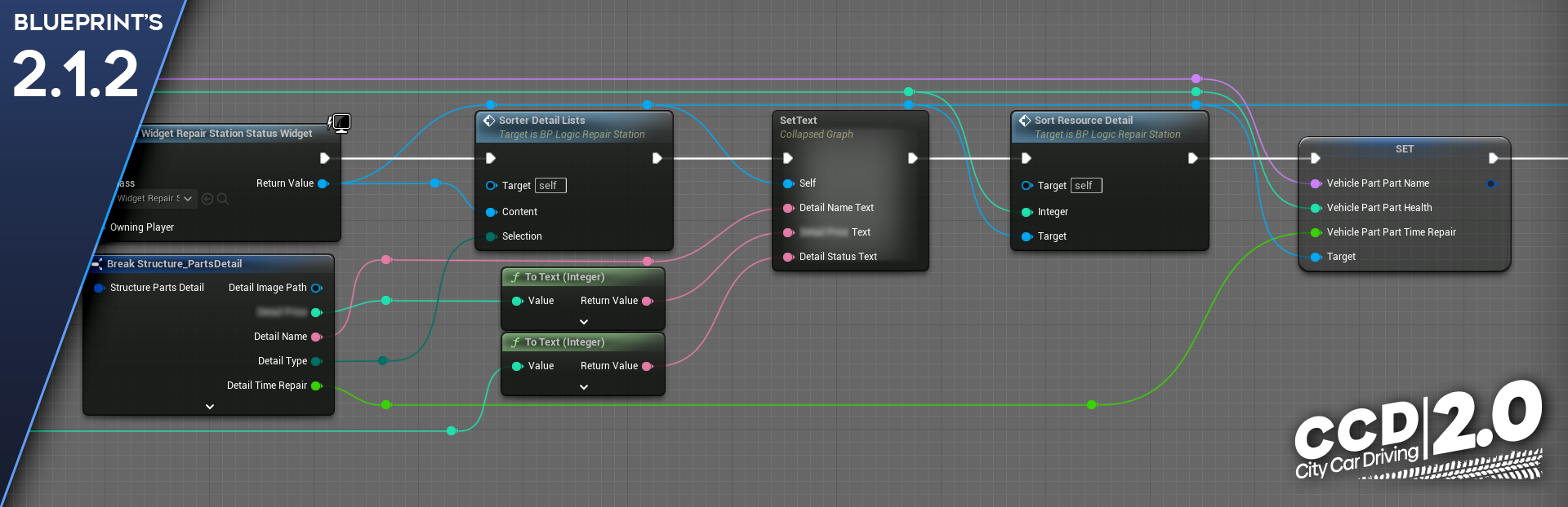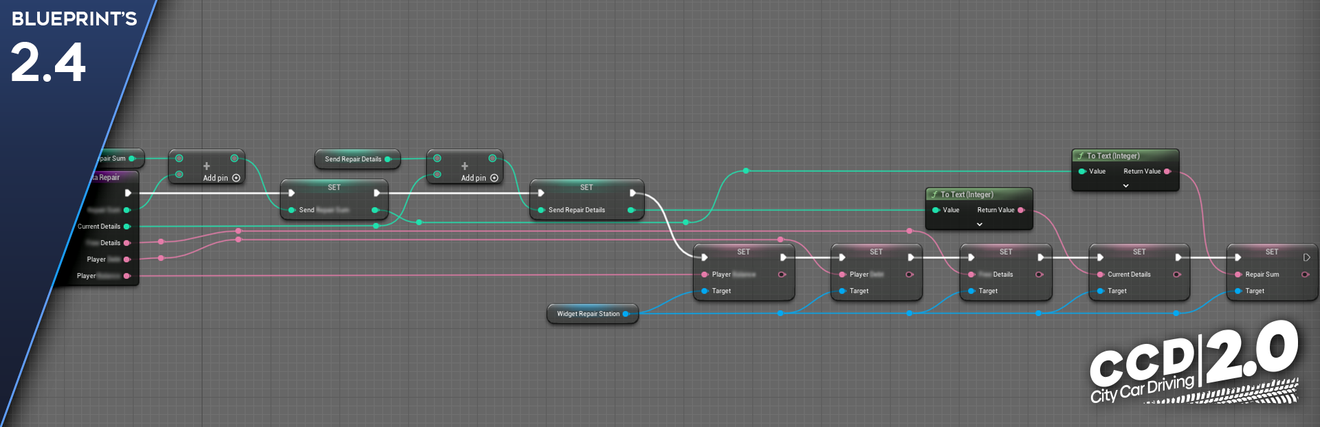 The ButtonRepairPressed_Event event is triggered if the player has pressed the button to select a specific part. In turn, this event triggers the logic of repairing one part. Inside the logic, the selected part is checked and repaired, the wear value is reset.