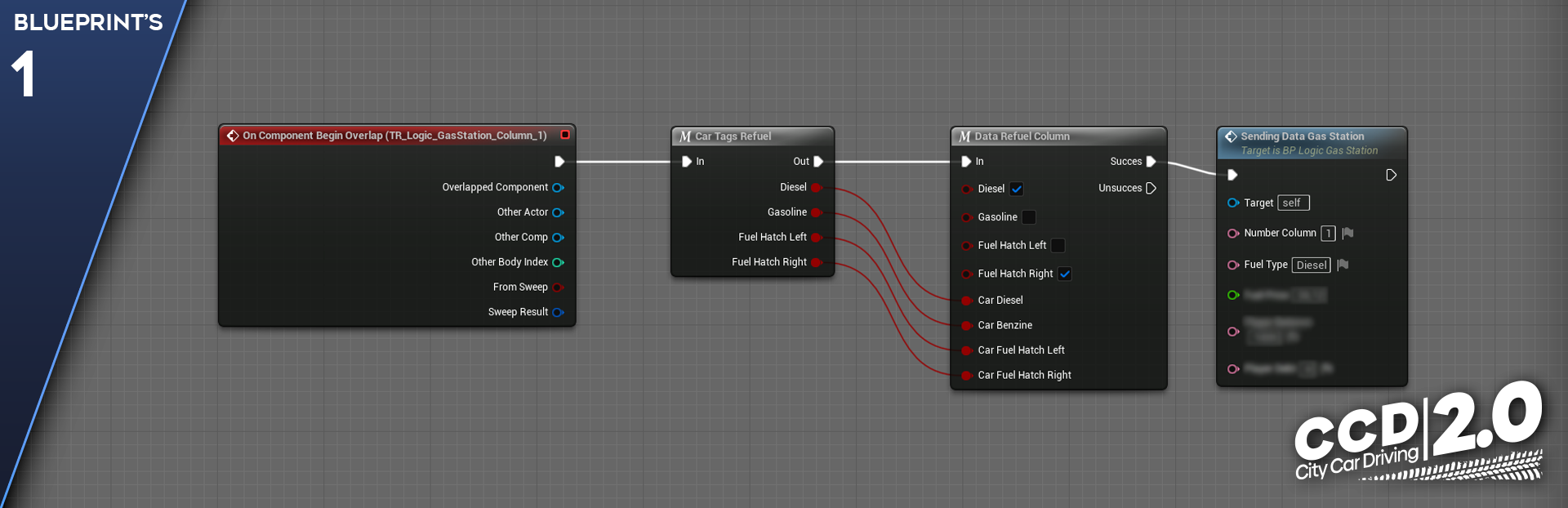 The OnComponentBeginOverlap event is called when the player hits the trigger of the refueling column, further logic is triggered.