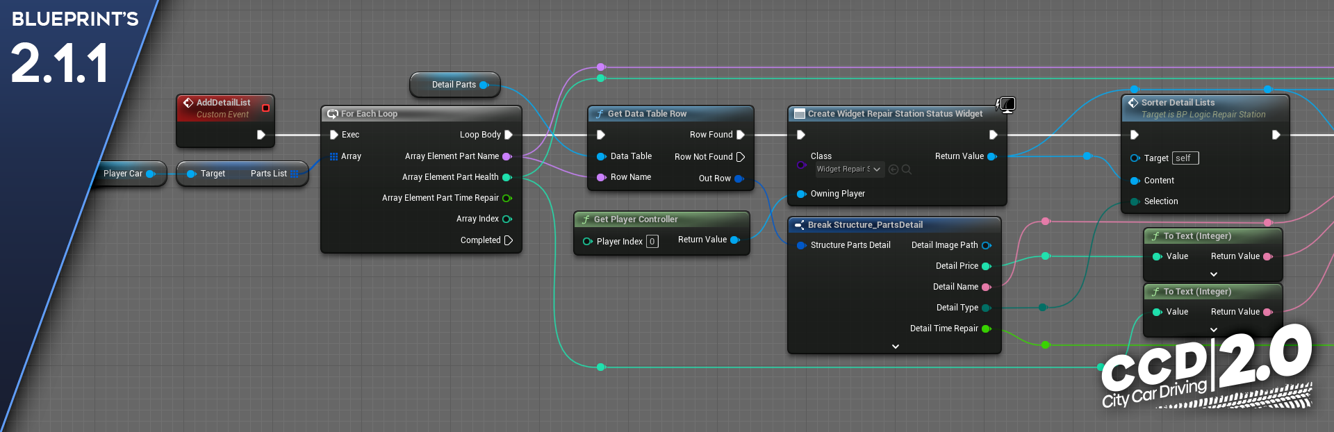 Calling the AddDetailList event triggers a logic chain that forms and sorts car parts into the user interface.