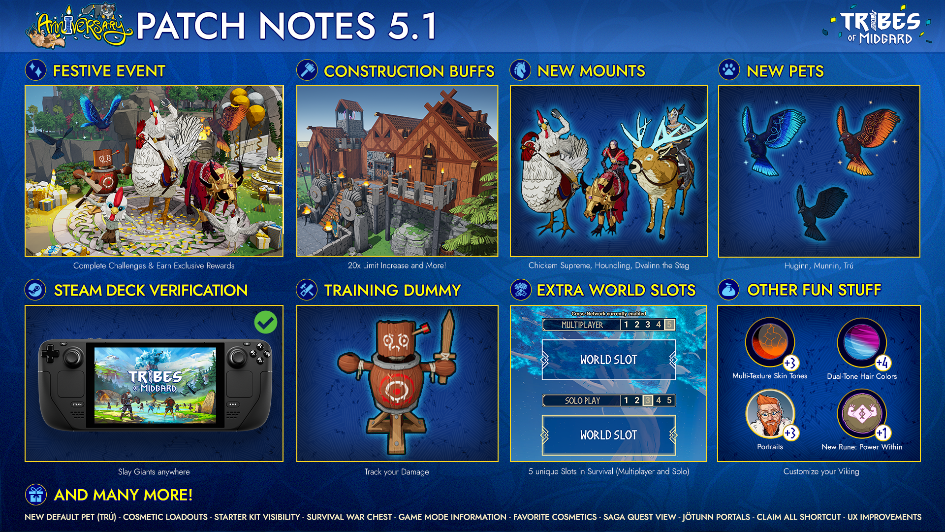 We’re very excited to share this Anniversary celebration with those who are most important to us: our amazing community. To express our love and appreciation, this update focuses on many community-requested features, like Construction system enhancements, QoL additions, and some fresh Cosmetics honoring community lore. 👀
