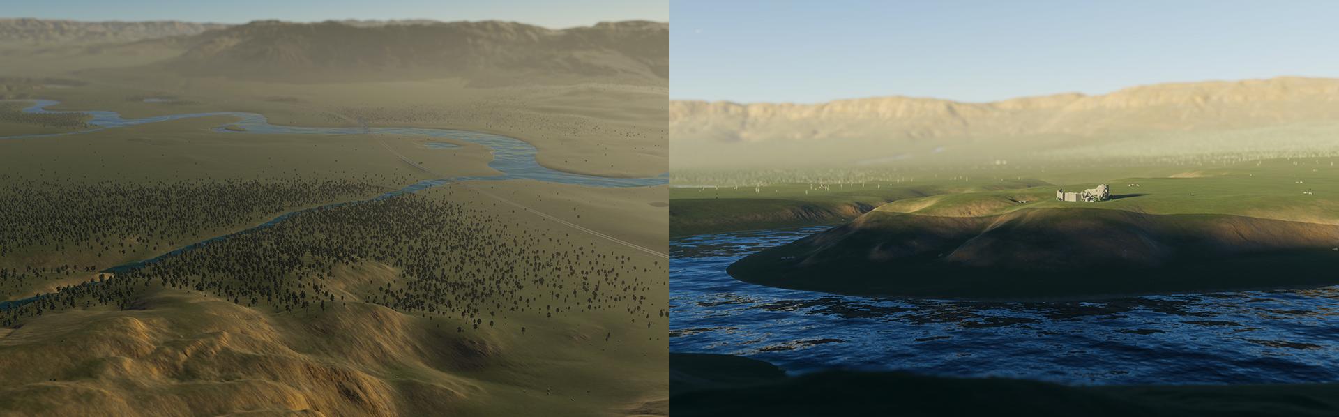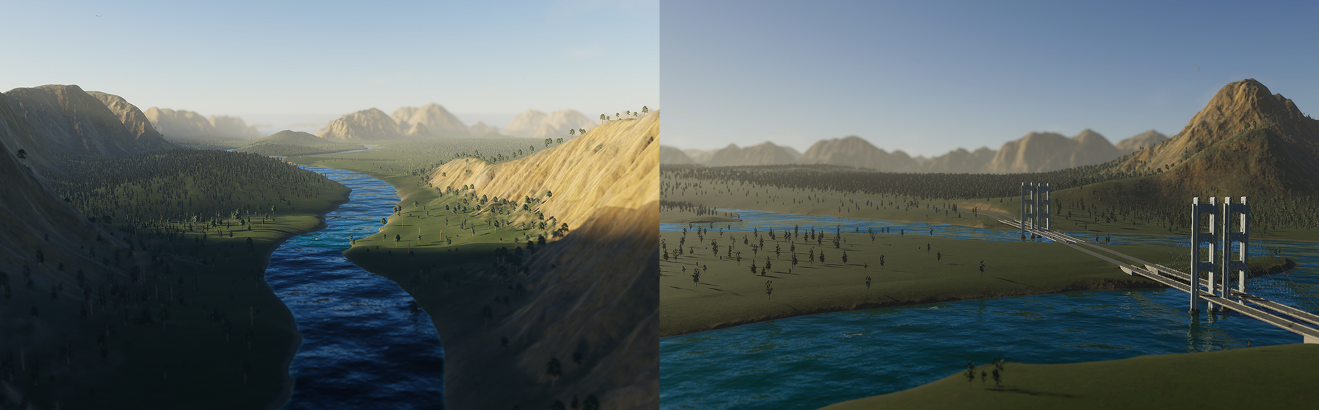 WATERWAY PASS Two colossal mountain ranges create natural map borders on two sides while the playable area is split by a meandering river flowing across the whole map with train tracks and highways on either side providing easy and quick access to the Outside Connections and the wide river banks leave lots of room for a growing city.