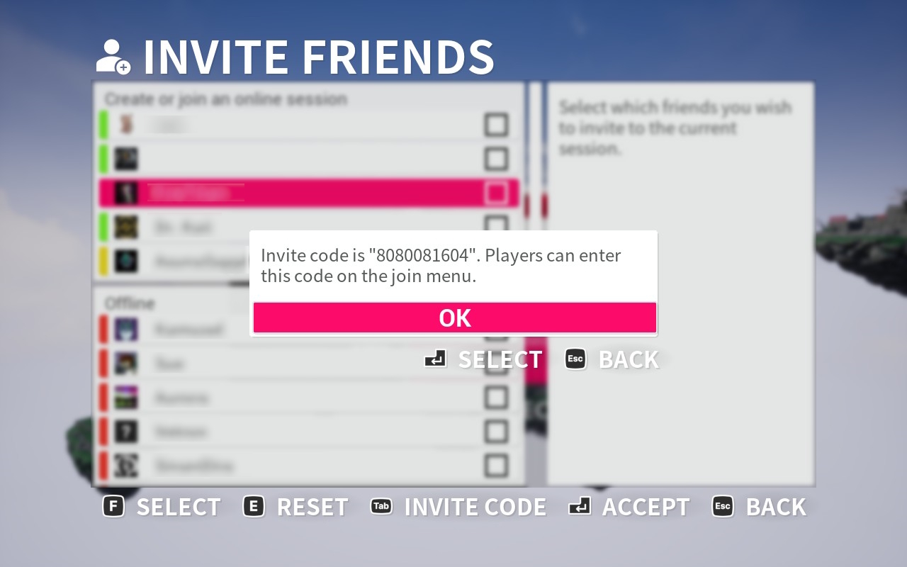 With this additional feature you can now invite players who aren't on your friends list to private or friends only sessions. The way this works is via generating an invite code which will be a unique 10 digit code that is only valid for that session. You can share this outside the game via any means you want, and then players will be able to enter that code on the join game menu to reach your session.