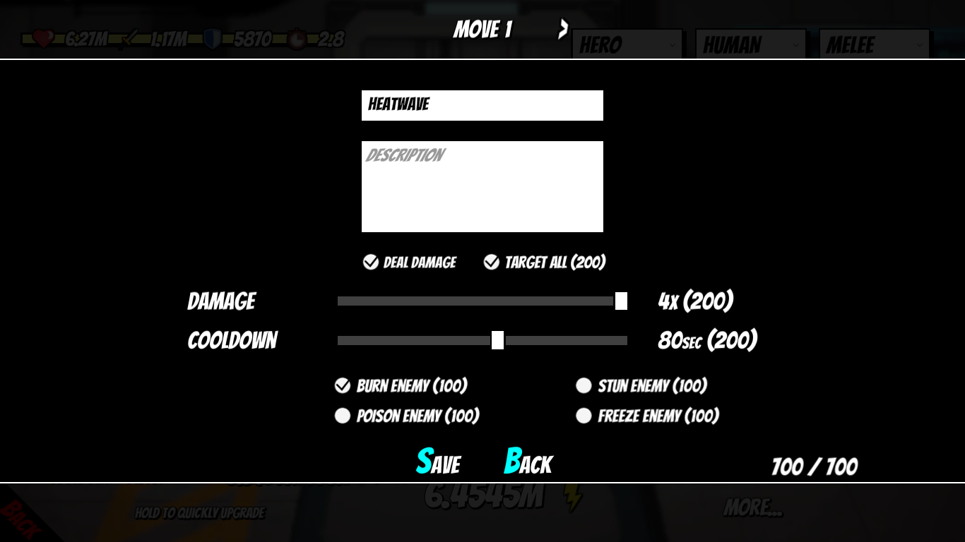 New in HyperLeague Heroes, equip your custom character with custom skills. Use the allotted points to create special attacks that fit your play style and make your hero or villain even more godly.