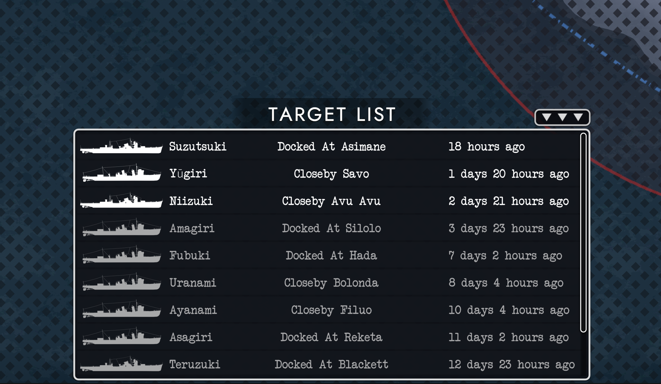 First of all, the target list we've previously discussed has been implemented in earnest. Named ships, mostly Fubukis and some Akizukis for now, will be given to you as priority targets for you to hunt down. They, of course, will not be alone; they will have light to medium boats and sometimes even other Destroyers accompanying them. They will patrol and fight like normal task forces, and will even be engaging allied forces they come across and take damage accordingly. This will dynamically create opportunities for you to pounce on them. On the rare chance that they are sufficiently mauled by an allied force, they will retreat to recuperate, and eventually come back again provide you an opportunity for you to engage and sink them.