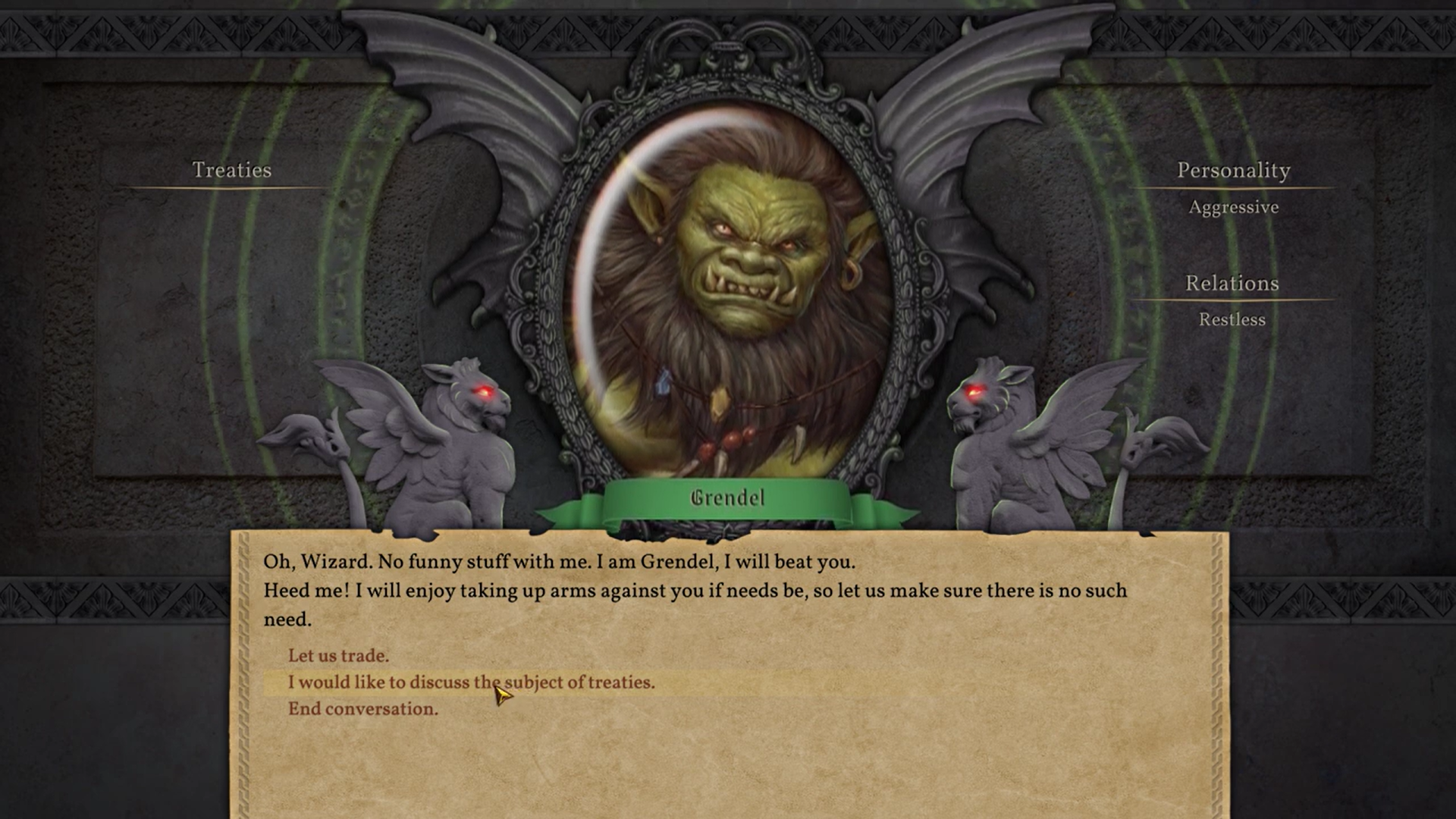 Grendel staunchly claims that even magic itself can be beaten into submission. While he possesses a rudimentary understanding of the Arcane arts and dabbles in Nature when necessary, Grendel primarily relies on the raw physical power of his troops to achieve victory, and exudes confidence in his ability to overpower opponents without relying on spells.