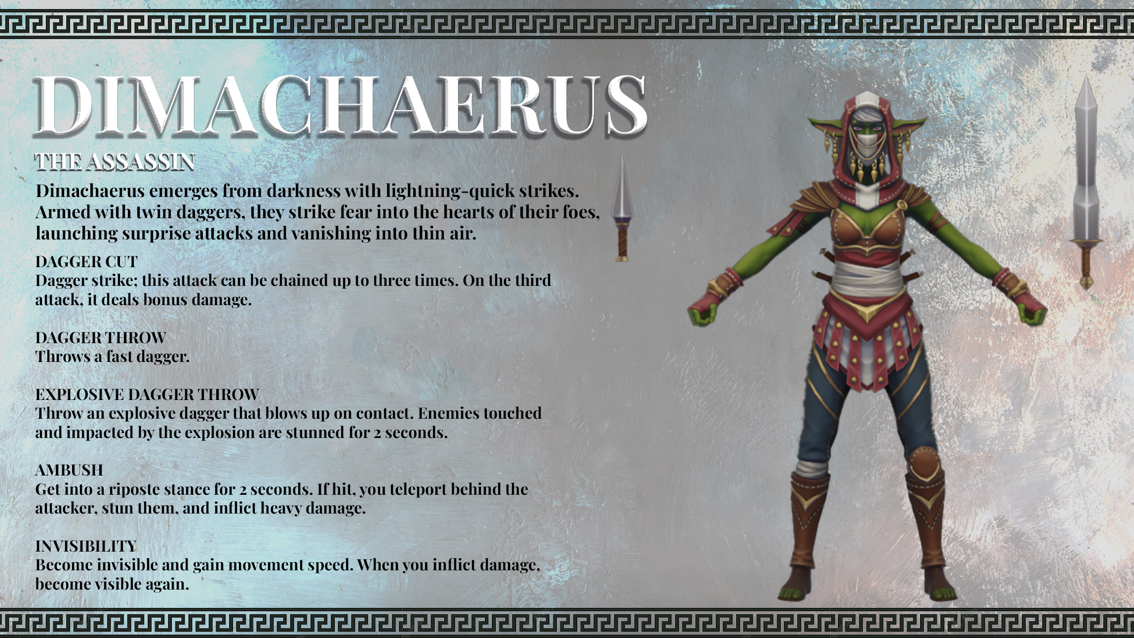 Inspired by the tales of mythic tricksters, Dimachaerus emerges from the darkness with lightning-quick strikes. Armed with twin daggers, they strike fear into the hearts of their foes, launching surprise attacks and vanishing into thin air. Legends speak of their mastery of ambush, teleportation, and the art of deception!