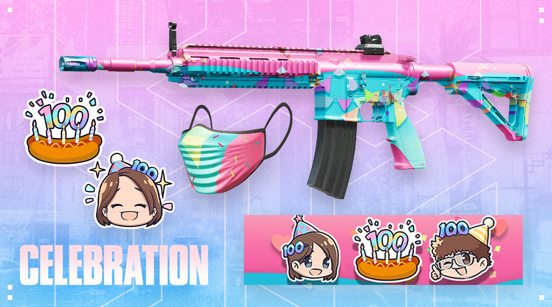 Rewards- ‘Celebration’ Weapon Skin, ‘Celebration’ Mask, ‘100 Days Congrats!’ Calling Card, ‘100 Days Congrats!’ Sticker, ‘100 Days Cakedog’ Sticker