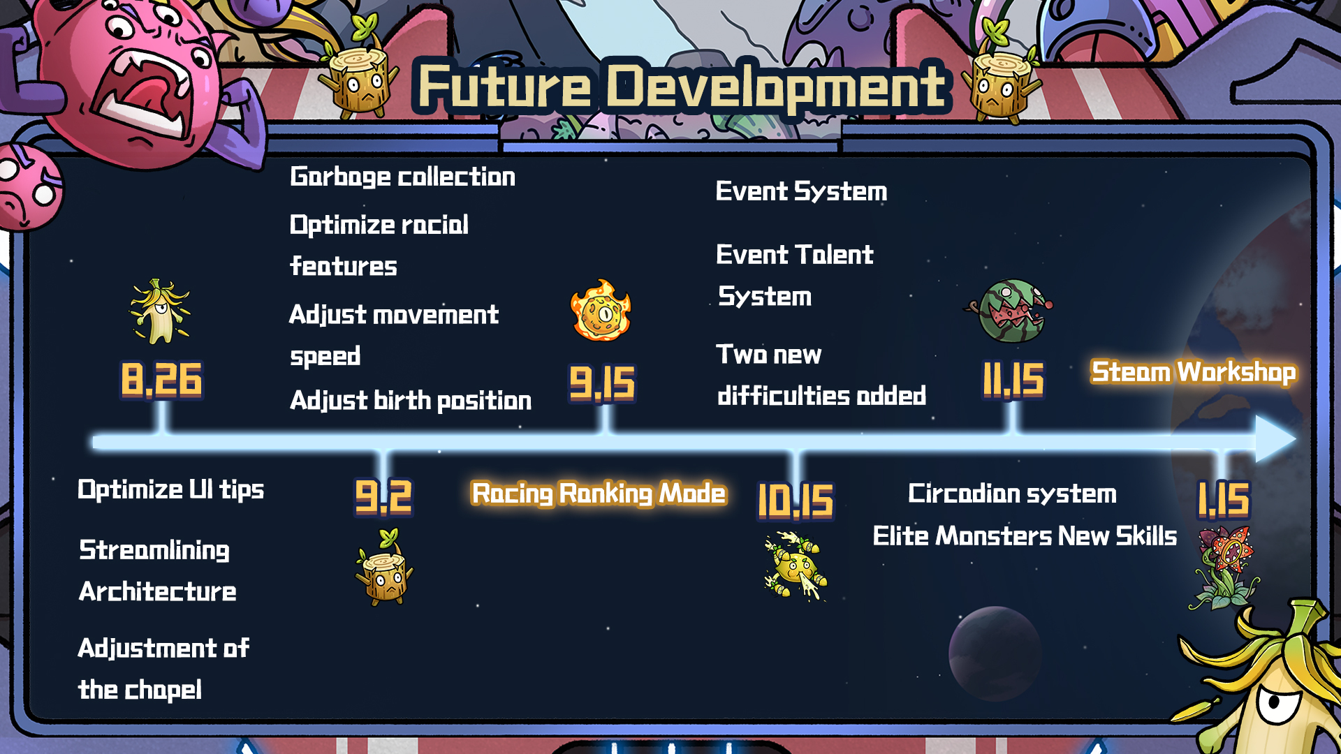 The September release will be one of our bigger releases, we'll be tweaking some of the monster attributes, as well as optimizing the characteristics of each race, and we'll be bringing the commonly requested garbage collection mechanism development online.