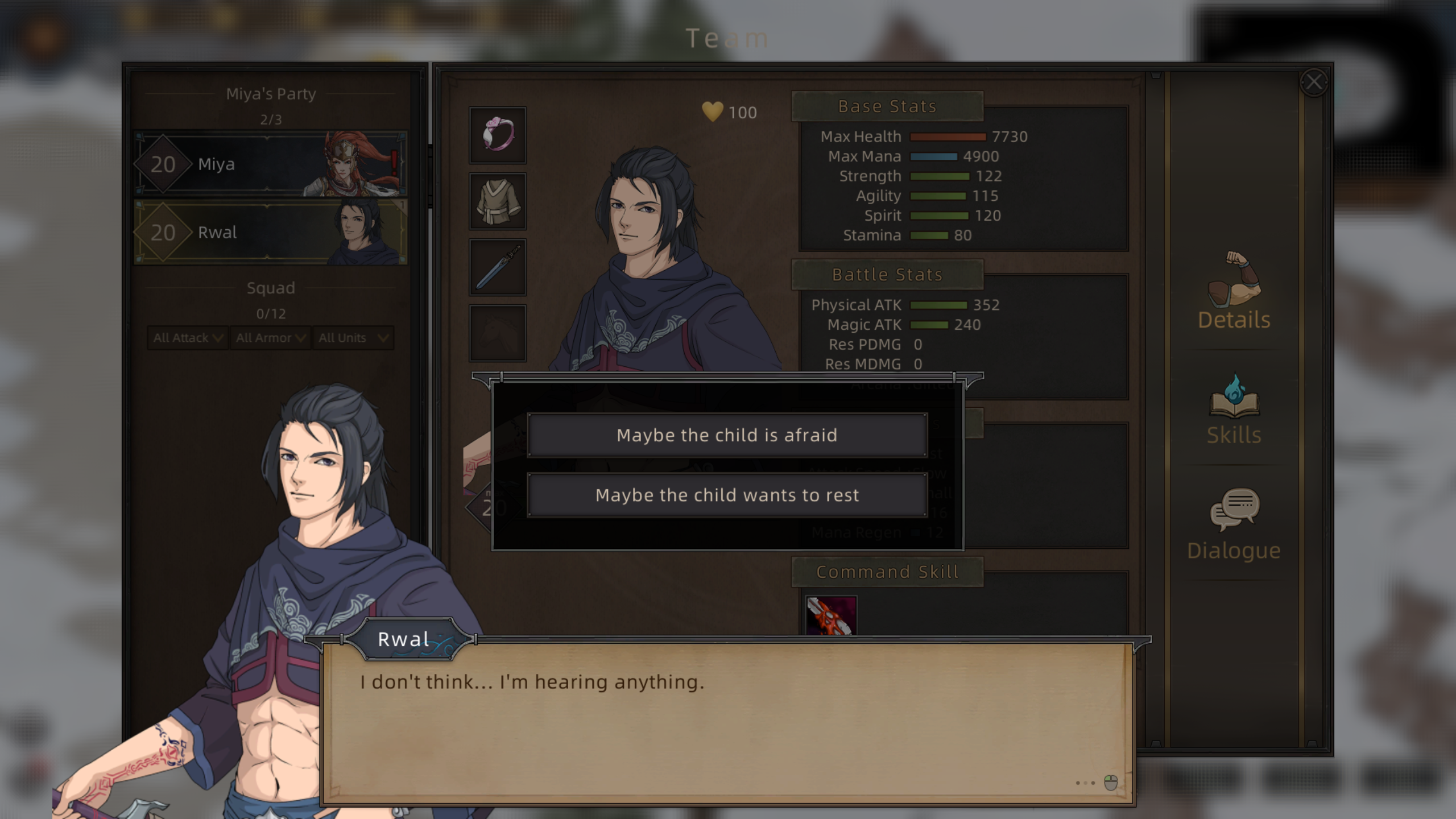 The story parts of child rearing are unique for female and male characters. A female character will be able to interact with their child to a greater extent, and even more story dialogue will be triggered if the child's father is also in the party.