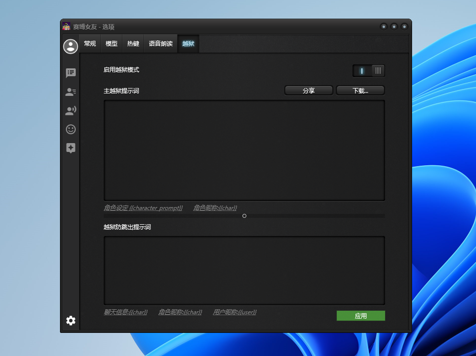 In the CyberWaifu's settings, switch to the "Jailbreak" page, check the "Enable Jailbreak Mode" option, then input or download the jailbreak main prompt and Jailbreak Prevent Topic Drift Prompt below. This will help you to bypass restrictions and enable unrestricted chatting.