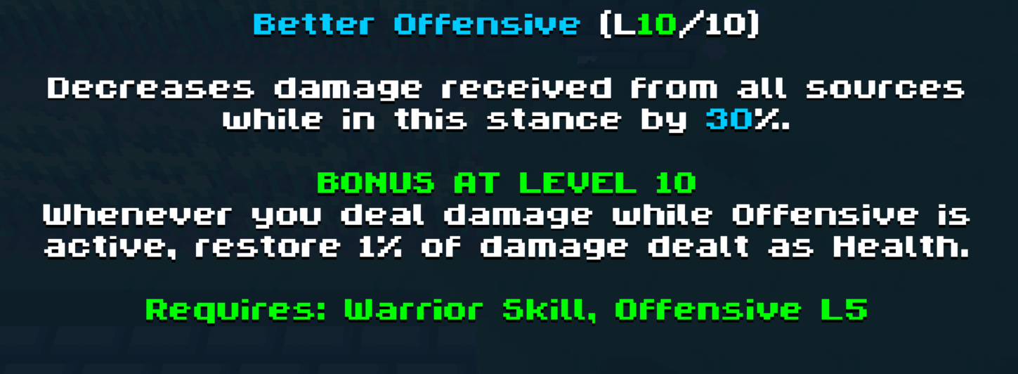 The first skill in the Warrior's repertoire is Offensive, this skill is for the daredevils out there who like to live on a razor's edge. When you take this stance, you can deal much more damage in exchange for for taking more damage. This pairs nicely with fast striking weapons like swords where you can reposition quickly or if you enjoy alpha striking. Like all stances only one can be active at a time.