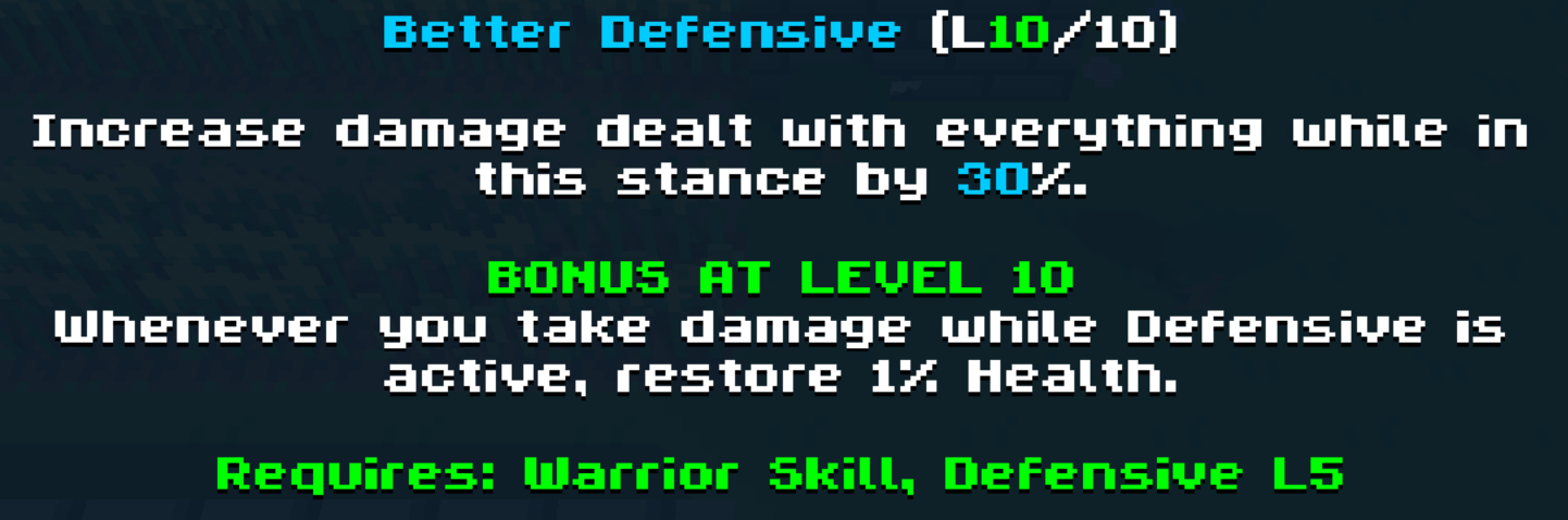 Sometimes taking a beating is a necessary part of adventuring, doesn't mean you have to make it easy. The second stance available to Warriors is Defensive, this stance allows you to take much more punishment at the expense of your damage output. This is especially help when you get in tricky situations where you need to make a hasty retreat or weather a crazy attack.