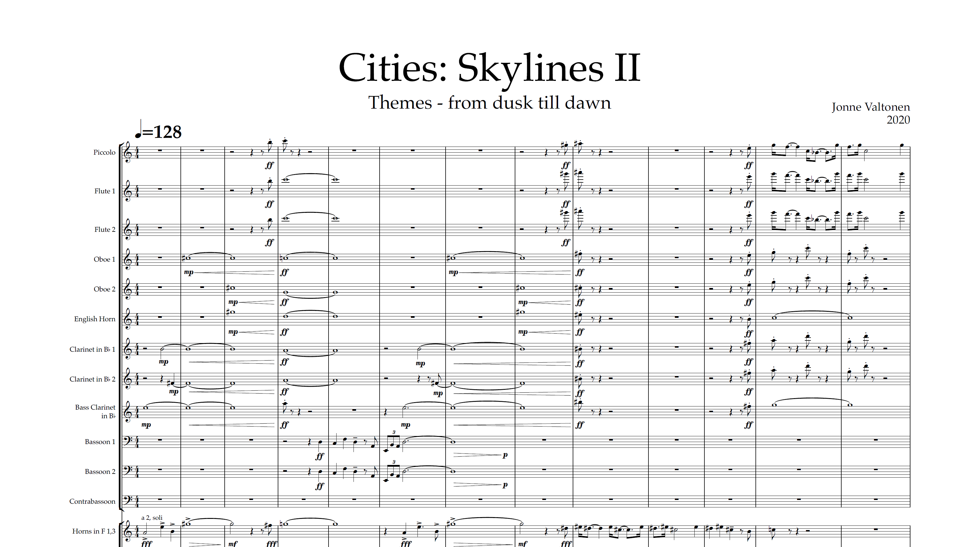 THEMES The Themes piece would introduce three different themes for different times of the day. This piece would not be used in the game but to showcase different thematic and textural materials. These are the day (main theme), evening, and night themes. The piece starts with a fanfare, as does the menu music. After the fanfare, the day theme starts out quite innocent and small. I had this idea that it is the dawn of the build and I am showing you the tools (= the theme) that the music will be built on. When the music progresses you get more instruments joining the overall flow - sometimes playing more soloistically and sometimes more as a group. After a grand iteration of the day theme, things settle. The evening is upon us. A bit mysterious and as things start to darken, you get a new evening theme introduced by the horn section while the tuba provides the bass. This mysterious, but still bright music paints the evening sky. And as always, the evening turns into a night. Now you have yet another theme introduced. And yes. It’s party time. The partying drives throughout the night and drives directly to the biggest iteration of the day theme. The whole orchestra joins the celebration and everything ends with a big and festive bang!”